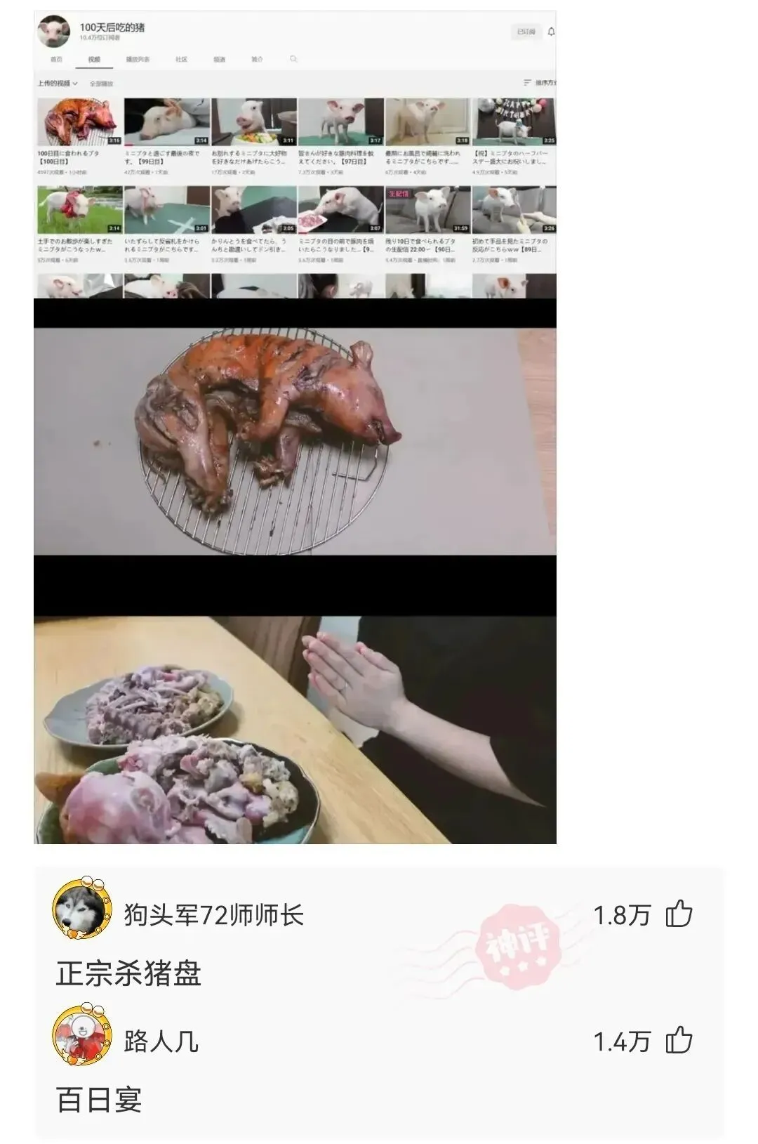 某日本小伙子养了一只小猪猪,然后各种宠爱各种晒照,吸引了一大波粉丝。然后呢,养到第一百天的时候,直播吃猪。。。。。
