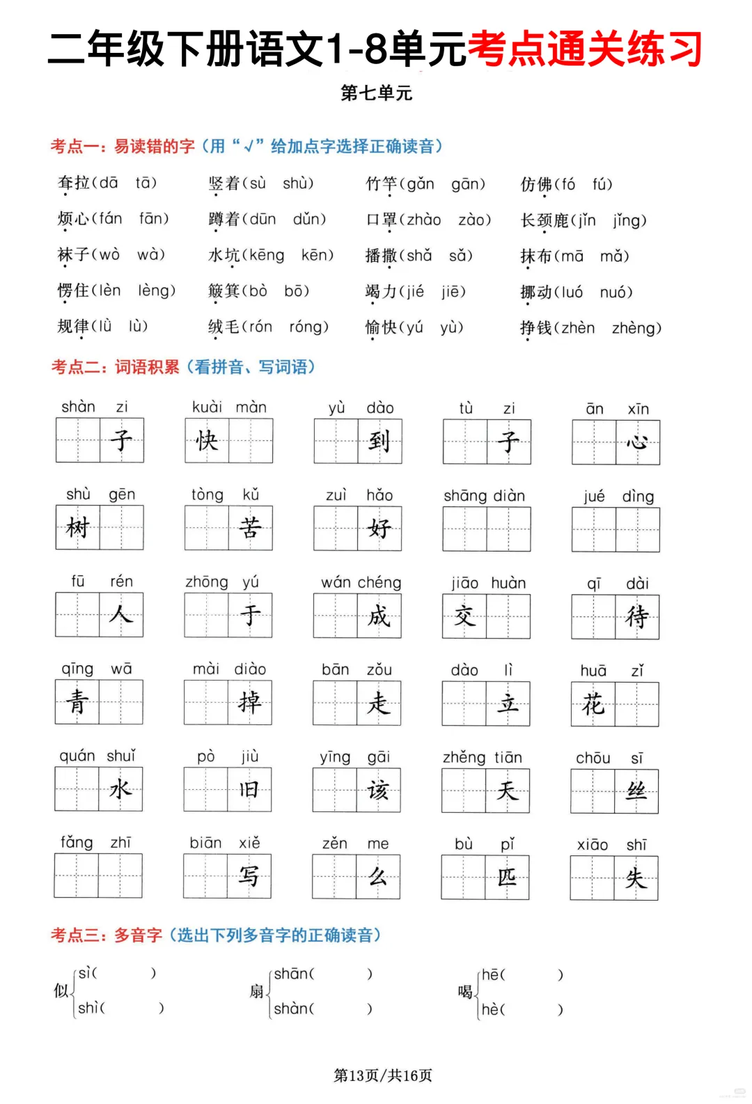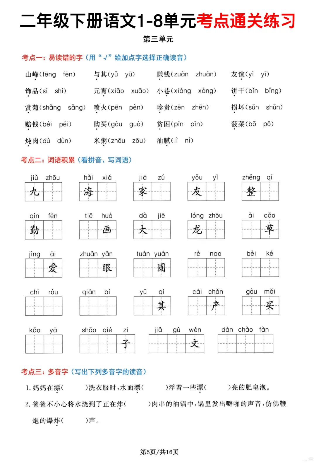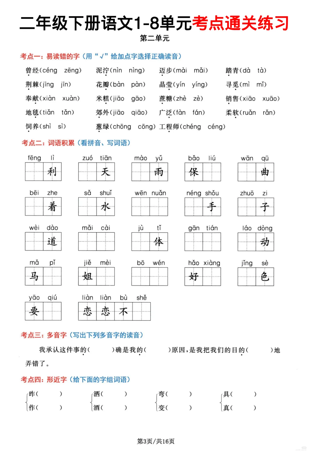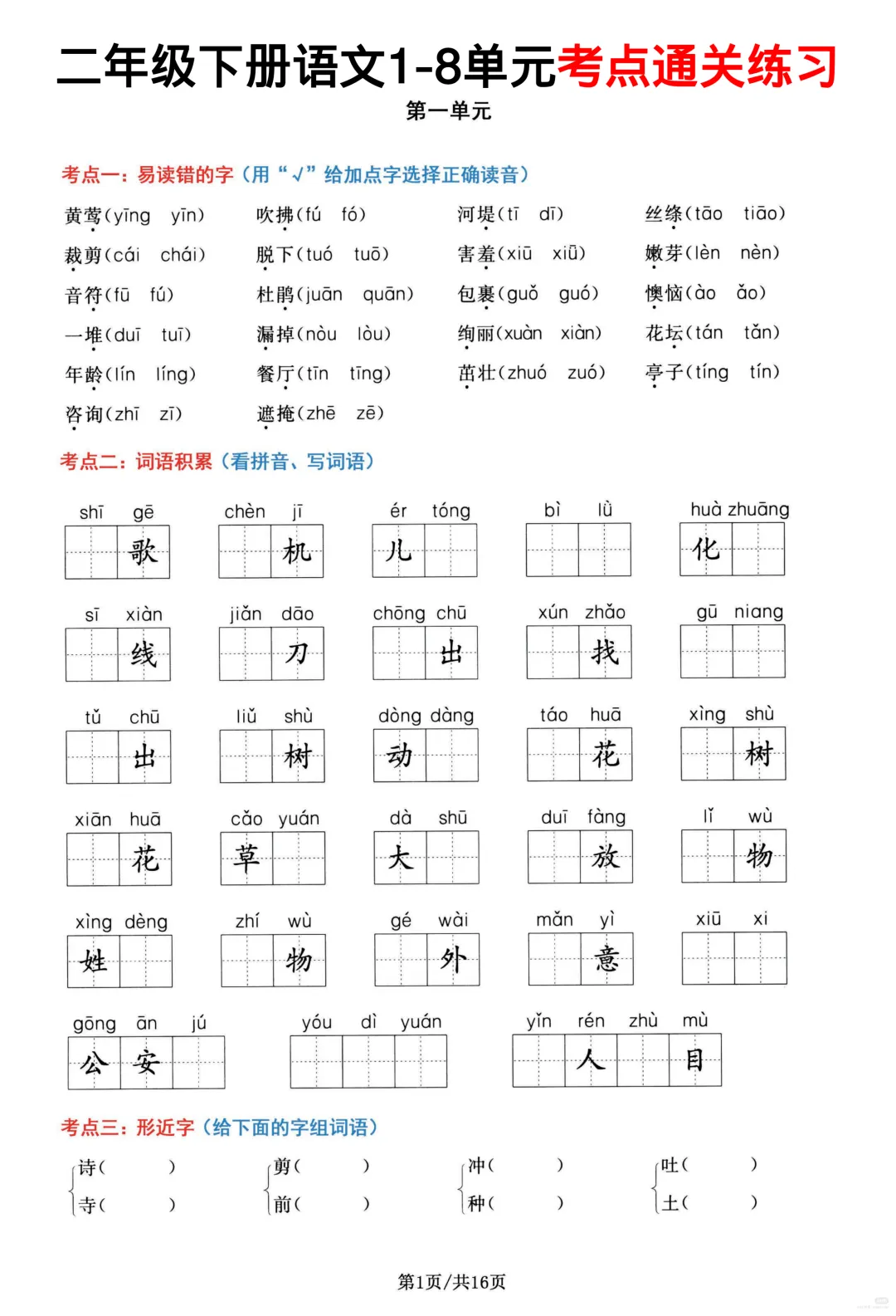 26春部编版二年级下册语文1-8单元高频考点通关练习(含答案)共16页,电子版可下载可打印,内容涵盖,每个单元的易错字辨别,看拼音写词语,多音字,形近字、词语积累,句子积累和积累背诵等等单元考点通关练习;对孩子的帮助非常大。需要的家长抓紧打印出来,让孩子练一练吧!