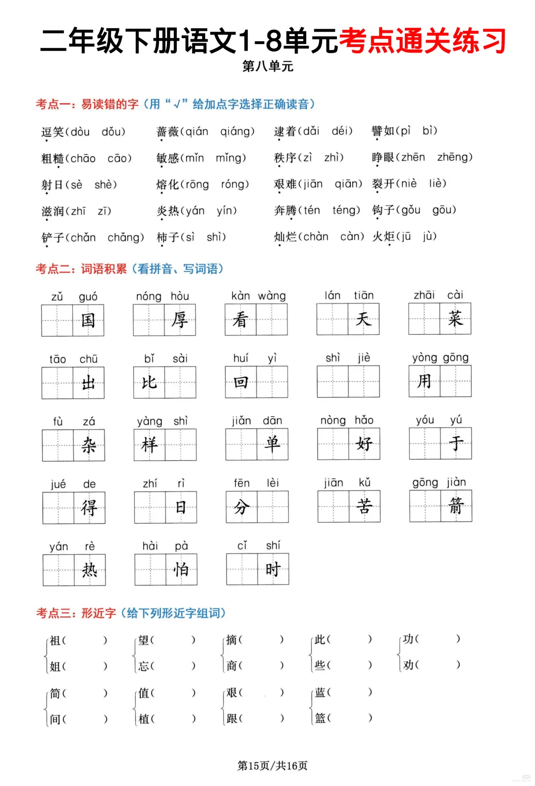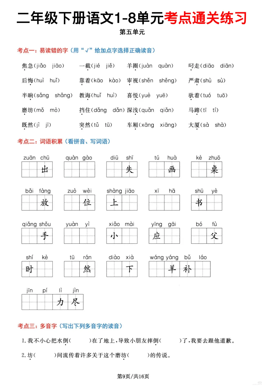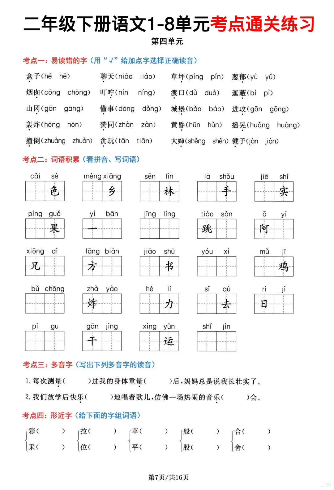 26春部编版二年级下册语文1-8单元高频考点通关练习(含答案)共16页,电子版可下载可打印,内容涵盖,每个单元的易错字辨别,看拼音写词语,多音字,形近字、词语积累,句子积累和积累背诵等等单元考点通关练习;对孩子的帮助非常大。需要的家长抓紧打印出来,让孩子练一练吧!