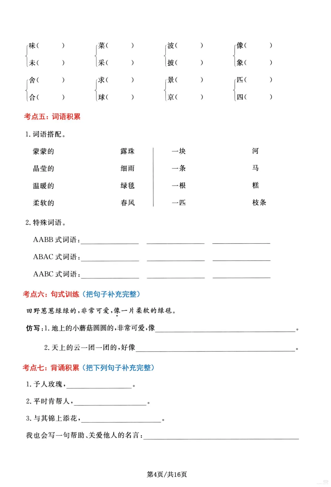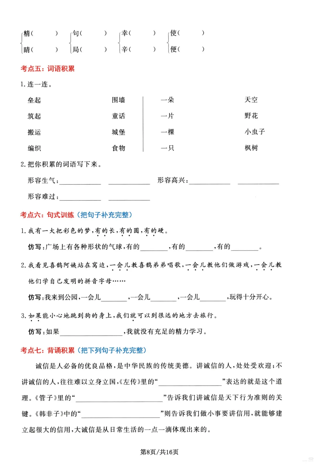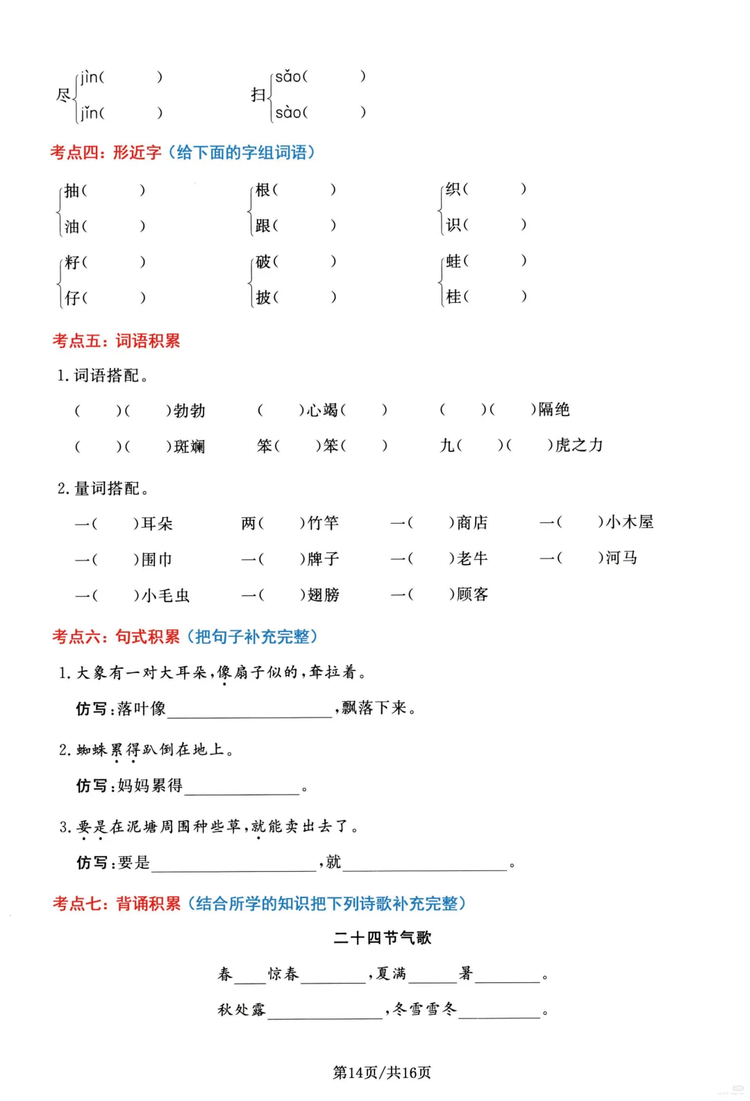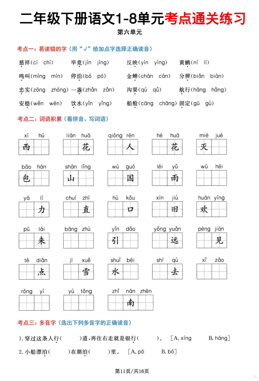 26春部编版二年级下册语文1-8单元高频考点通关练习(含答案)共16页,电子版可下载可打印,内容涵盖,每个单元的易错字辨别,看拼音写词语,多音字,形近字、词语积累,句子积累和积累背诵等等单元考点通关练习;对孩子的帮助非常大。需要的家长抓紧打印出来,让孩子练一练吧!