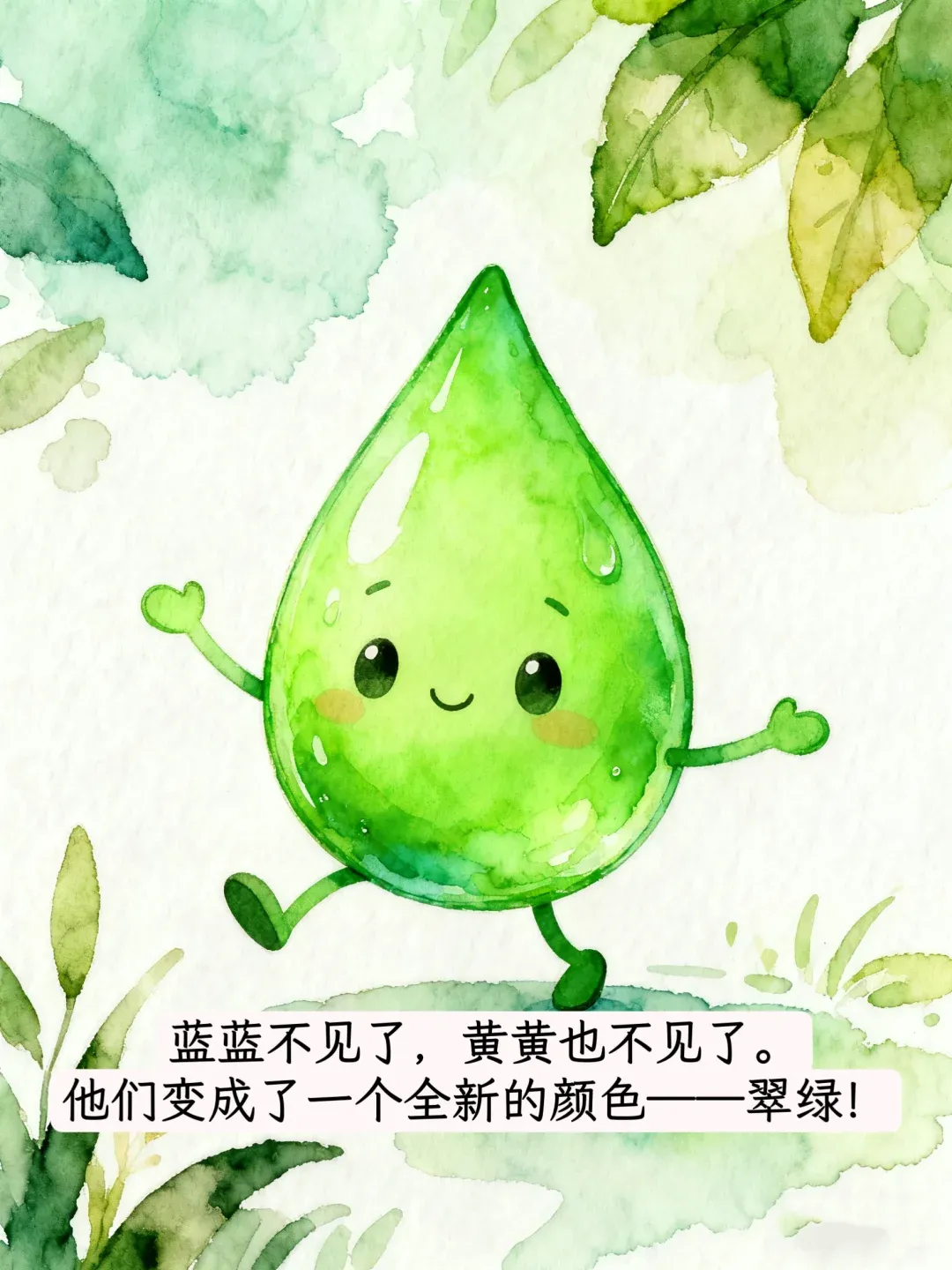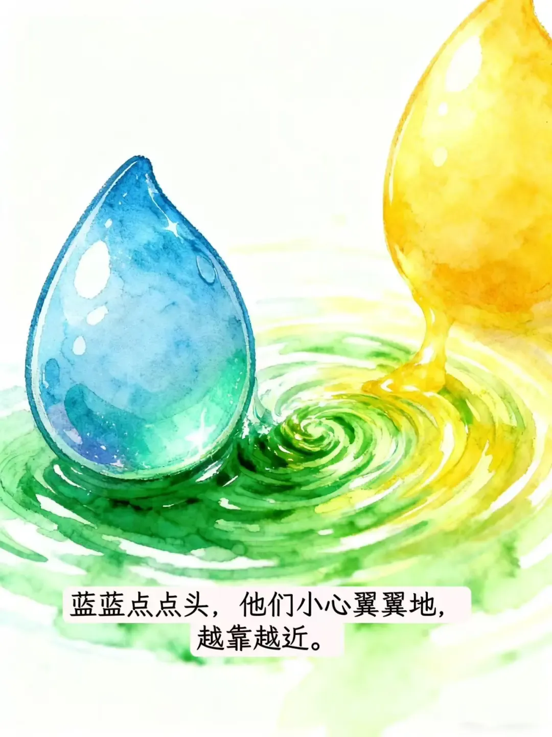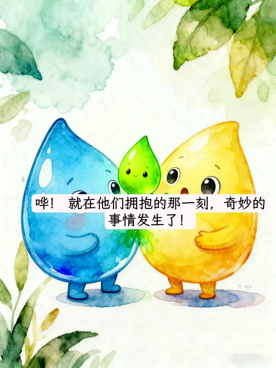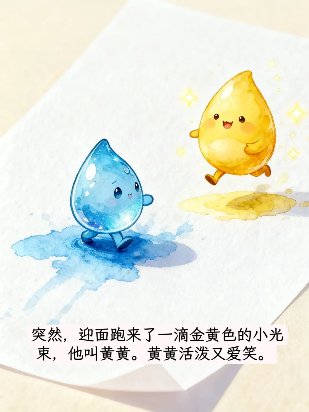 ✨ 故事概括 蓝色小水滴蓝蓝独自在颜料盒里很孤单,跳出后在白纸上滚动时,遇到金黄色的黄黄。两人拥抱融合,变成翠绿色的绿绿;随后热情的红红加入,三者融合成温暖的棕色。彩虹精灵出现,讲解颜色混合的魔法,最终所有颜色在纸上流动,形成和谐色块。