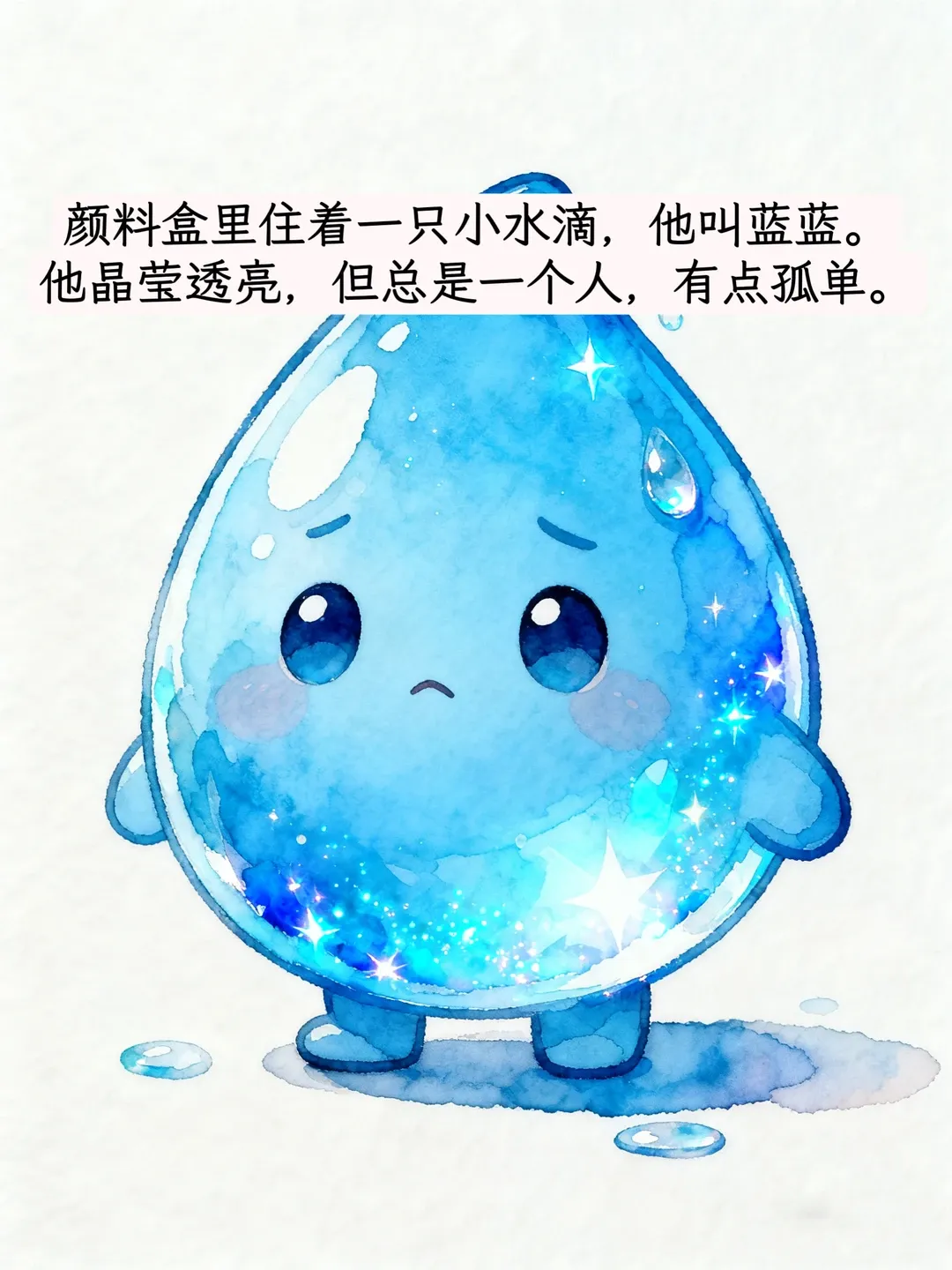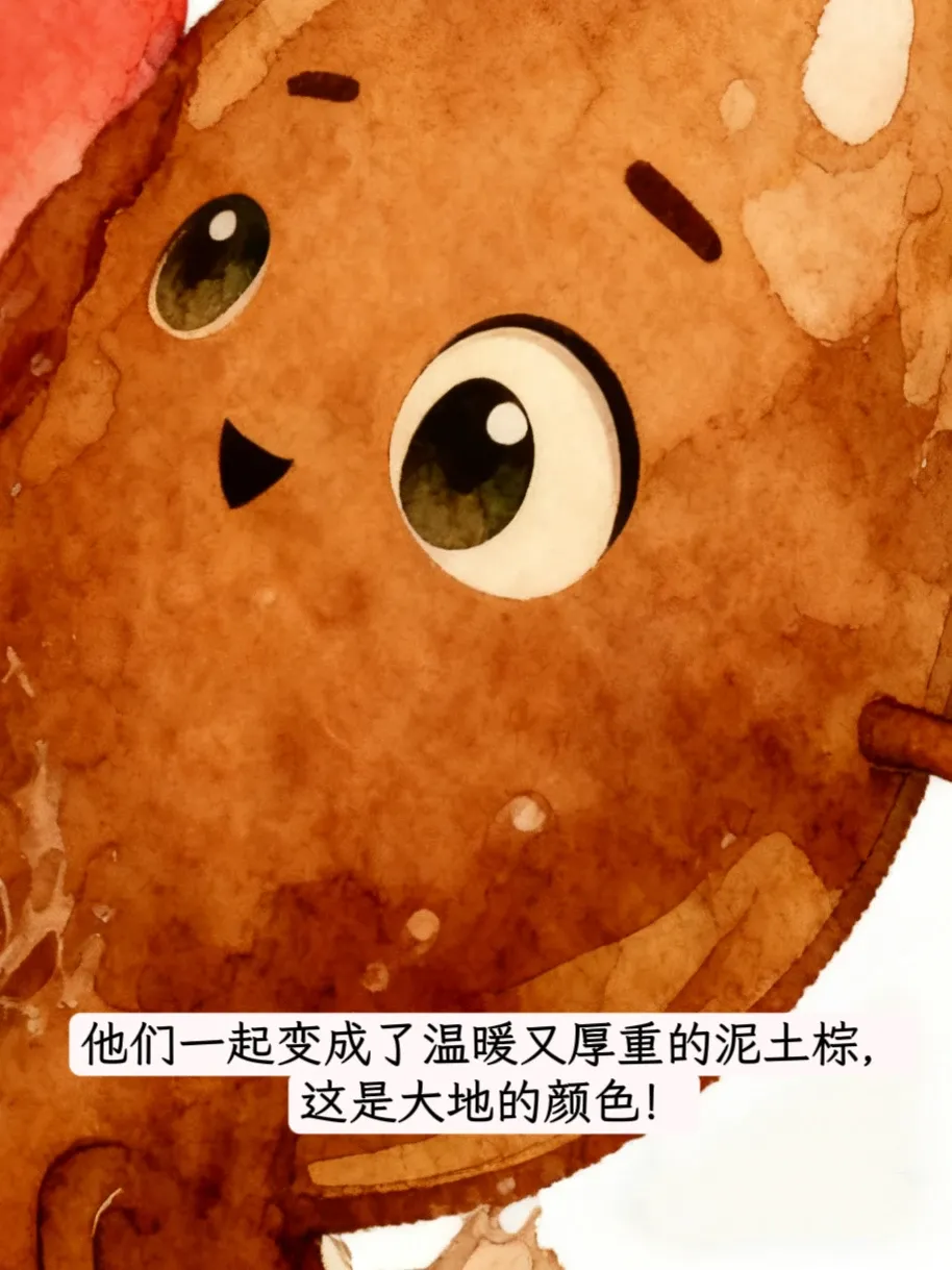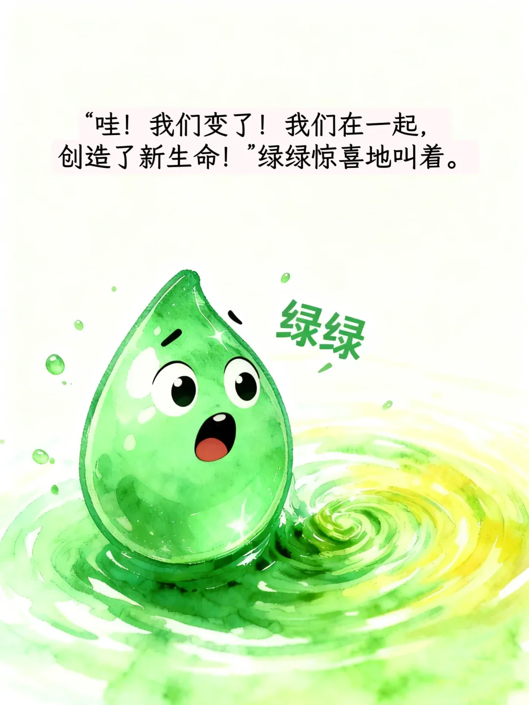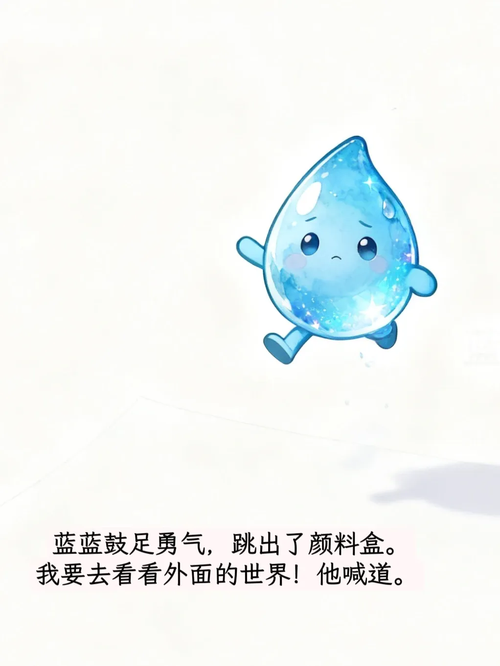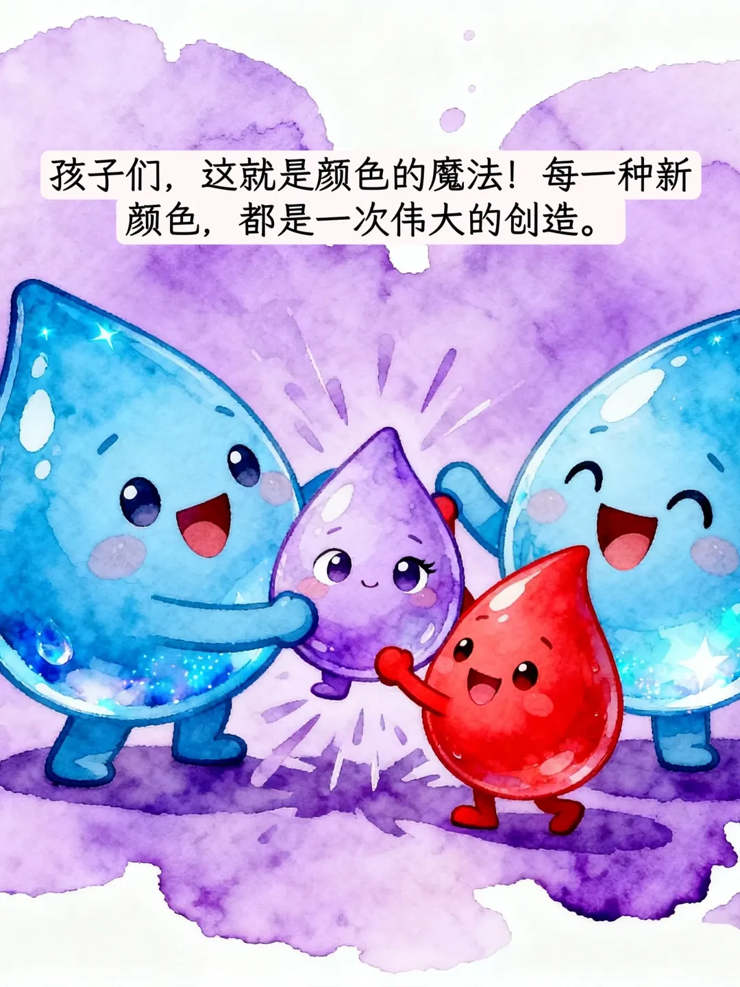 ✨ 故事概括 蓝色小水滴蓝蓝独自在颜料盒里很孤单,跳出后在白纸上滚动时,遇到金黄色的黄黄。两人拥抱融合,变成翠绿色的绿绿;随后热情的红红加入,三者融合成温暖的棕色。彩虹精灵出现,讲解颜色混合的魔法,最终所有颜色在纸上流动,形成和谐色块。