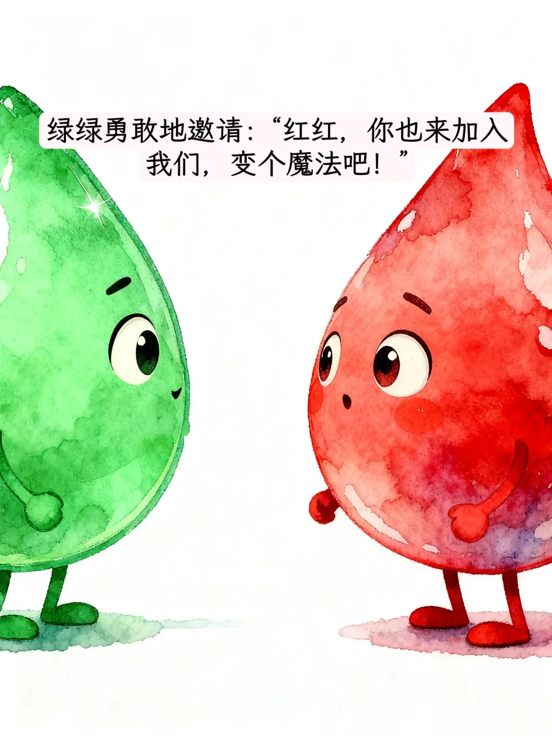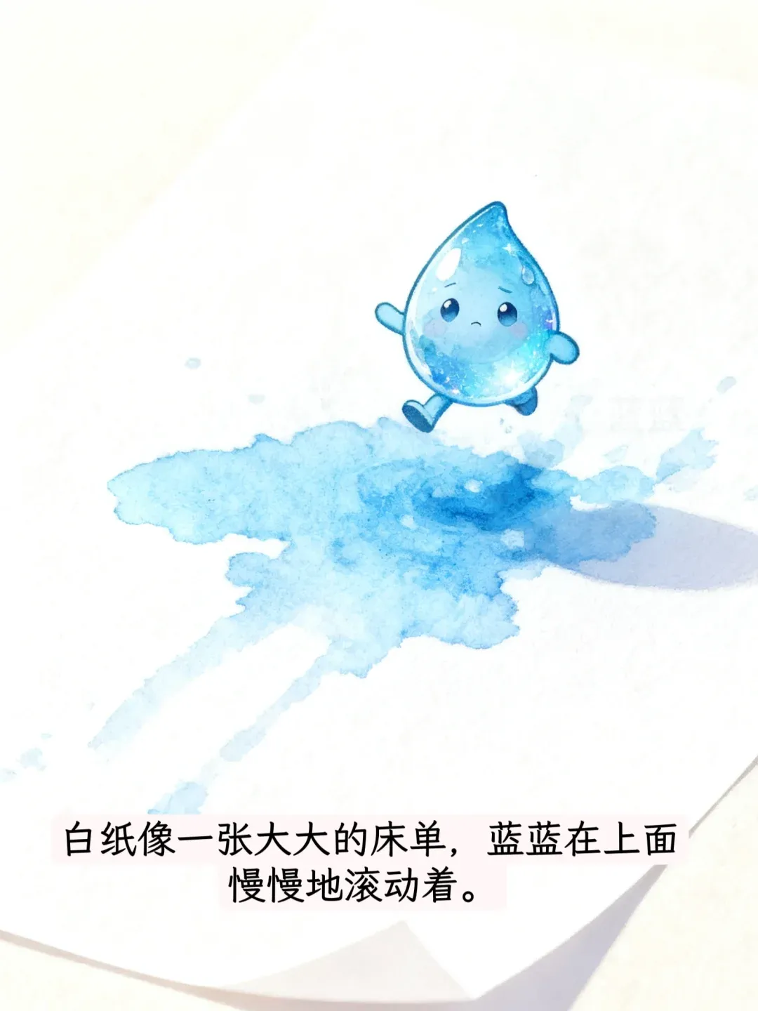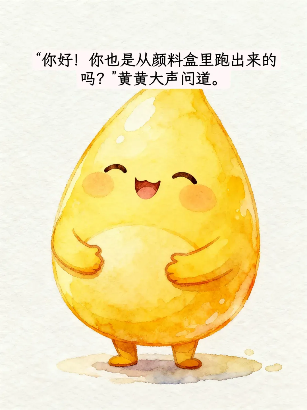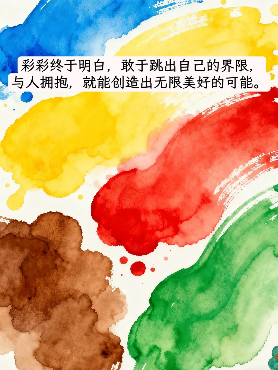 ✨ 故事概括 蓝色小水滴蓝蓝独自在颜料盒里很孤单,跳出后在白纸上滚动时,遇到金黄色的黄黄。两人拥抱融合,变成翠绿色的绿绿;随后热情的红红加入,三者融合成温暖的棕色。彩虹精灵出现,讲解颜色混合的魔法,最终所有颜色在纸上流动,形成和谐色块。