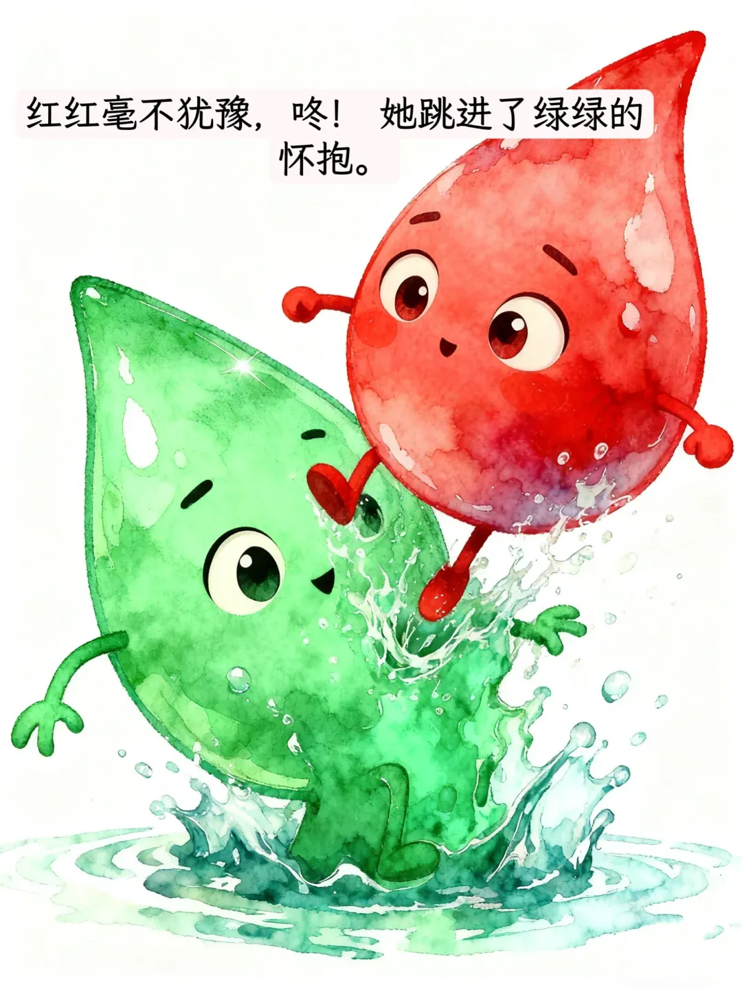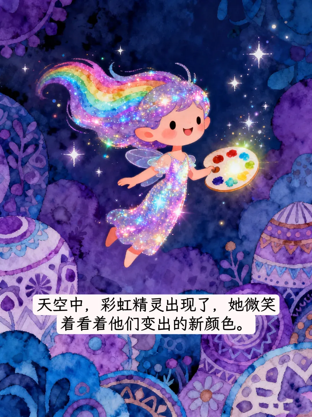 🎯 绘本亮点 1.认知直观:以水滴融合具象呈现混色原理,动态画面还原变色过程; 2.情感联结:借 “孤单 — 相遇 — 融合” 传递包容与协作,赋予颜色情感属性; 3.童趣奇幻:彩虹精灵、会动的水滴等设定,让科普充满奇幻感。