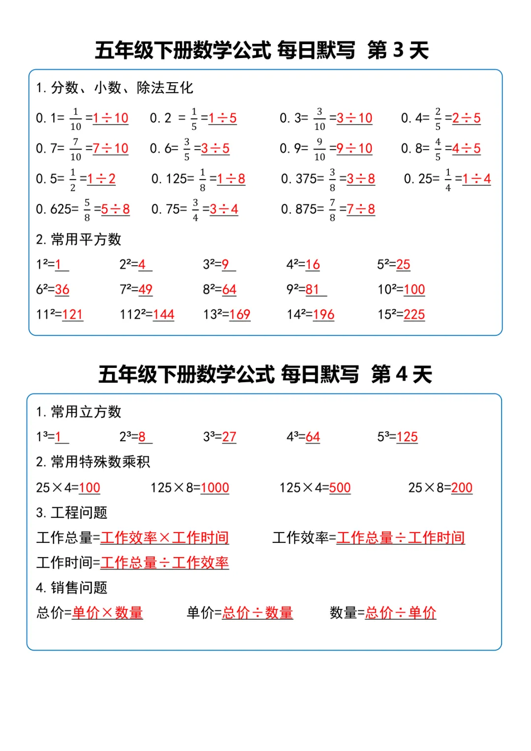 五年级(下)数学 数学公式每日默写小纸条电子版PDF,10页,免费下载