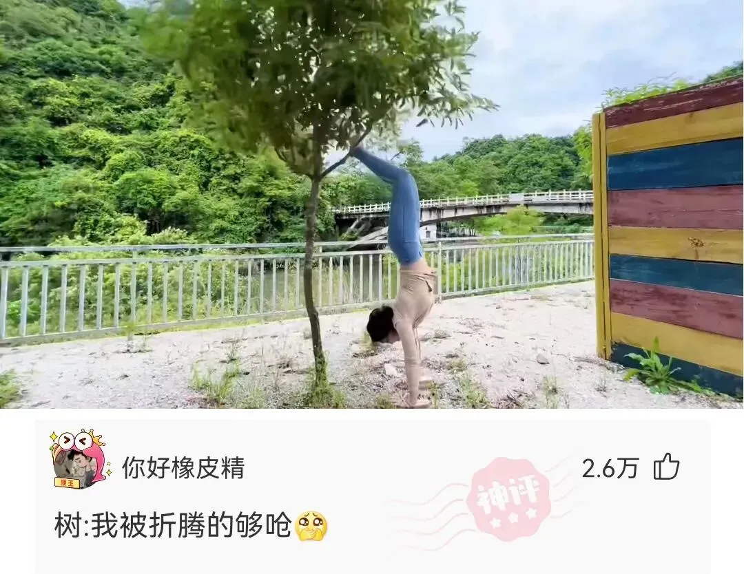 一女的倒立,还能把树晃得的嘎嘎乱颤!这谁顶得住!