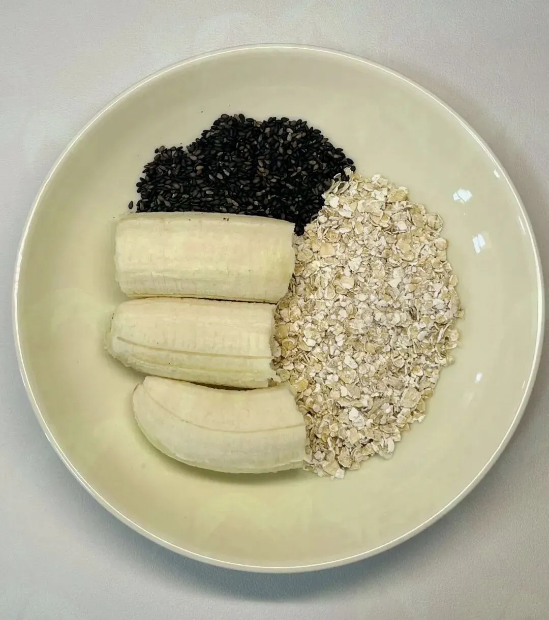 一根香蕉、20克燕麦、15克熟黑芝麻、200毫升牛奶、300毫升水,用破壁机一打就行啦。比奶茶好喝,喝完饱腹感还挺强的。