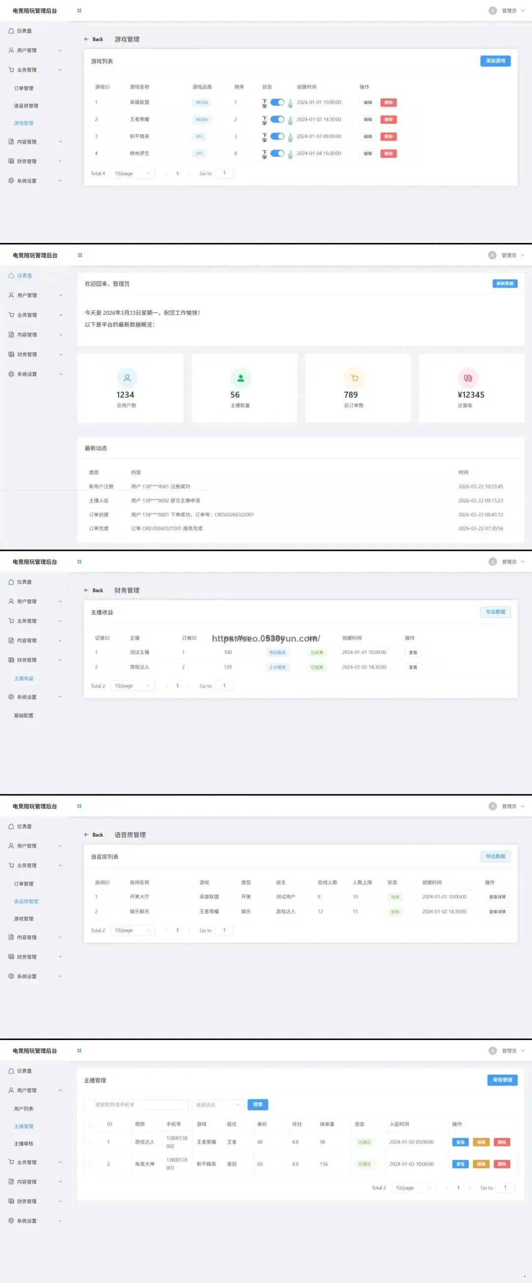 – 用户统计、主播统计、订单统计、语音房统计、收益统计