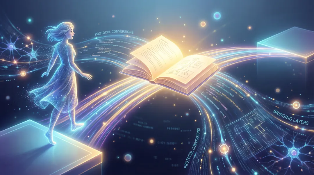 {一份文档化作桥梁 — 发光的技术文档展开成一座连接两个世界的桥}