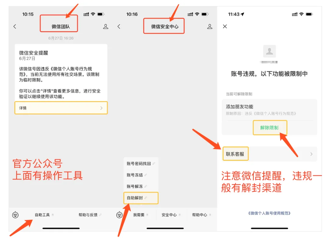 登录受限账号 → 点击封禁提示框中的「申请解除限制」→ 选择「微信团队自助工具」。 -
