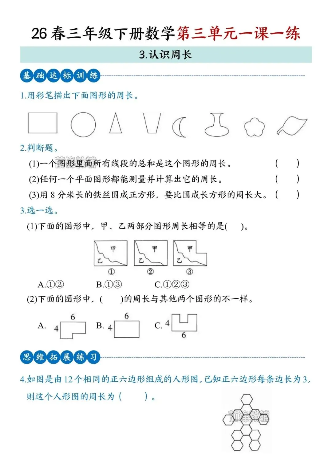 今日为大家更新了最近超火的学习资料,26春三年级下册数学第三单元一课一练(电子版可打印),建议分享到班级群/年级群,让其他家长打印出来,帮助孩子学习!