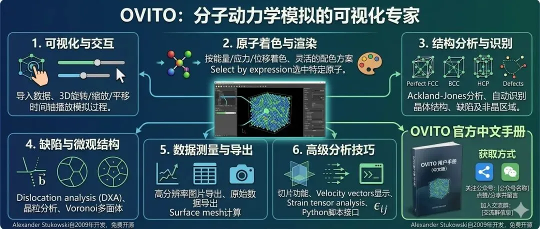 OVITO全称Open Visualization Tool,中文可以叫“开放可视化工具”。名字听起来挺低调,但这个软件在分子动力学领域可以说是无人不知、无人不晓。全球有几万研究者在用,每天打开电脑第一件事就是打开OVITO,看看昨天跑的模拟跑成什么样了。不管做金属、聚合物还是生物分子,大家都用它。为什么?因为它解决了分子动力学领域最大的痛点:怎么把一堆数字变成能看的图。更关键的是,这个软件完全免费开源,不需要任何license。创始人Alexander Stukowski从2009年开始开发,坚持做了十五年,这种人值得尊敬。