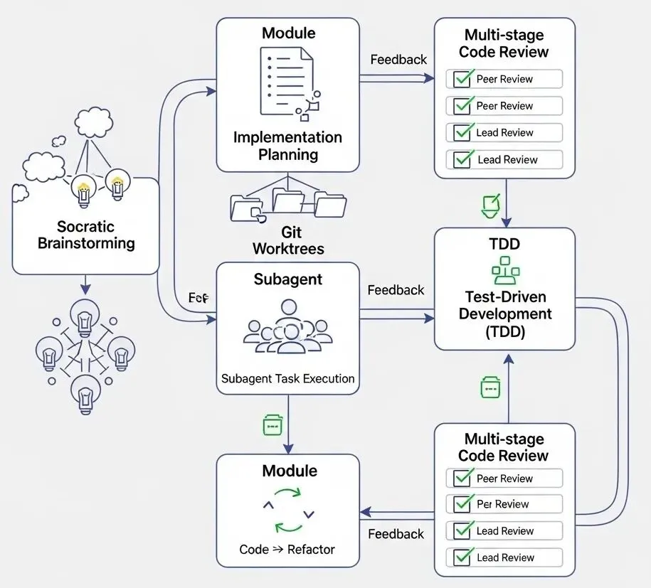 很多人刚看到Superpowers会以为是又一个AI代码生成工具,其实完全不是。它的核心理念是做**”AI编程代理的操作系统”,本质上是一套AI能读懂的开发SOP手册**,让AI按照专业开发者的流程和规范来帮你干活,而不是直接给你写代码。