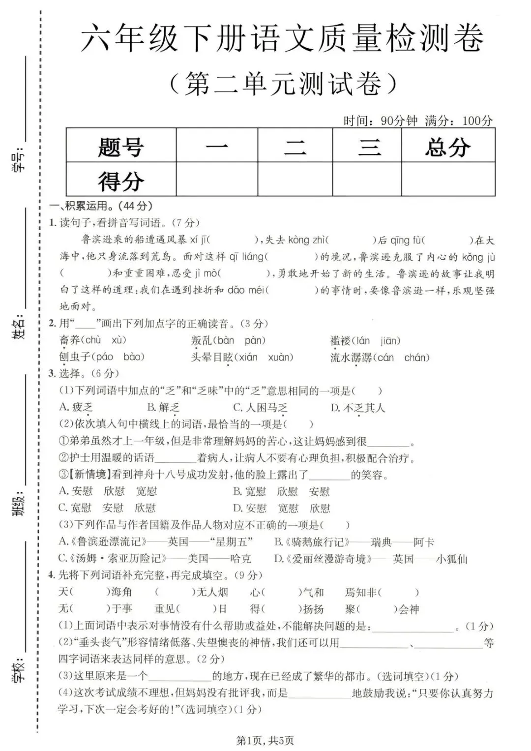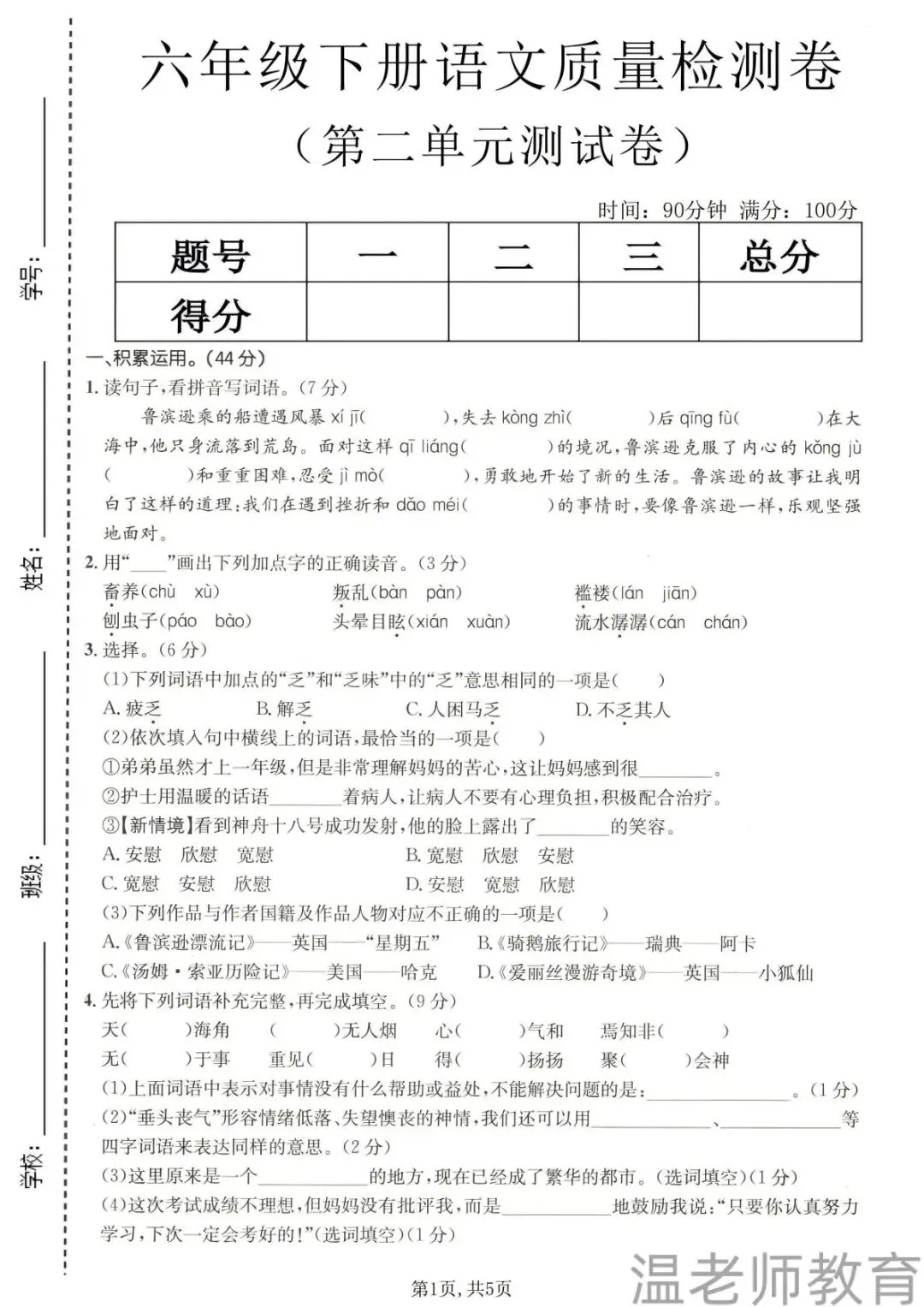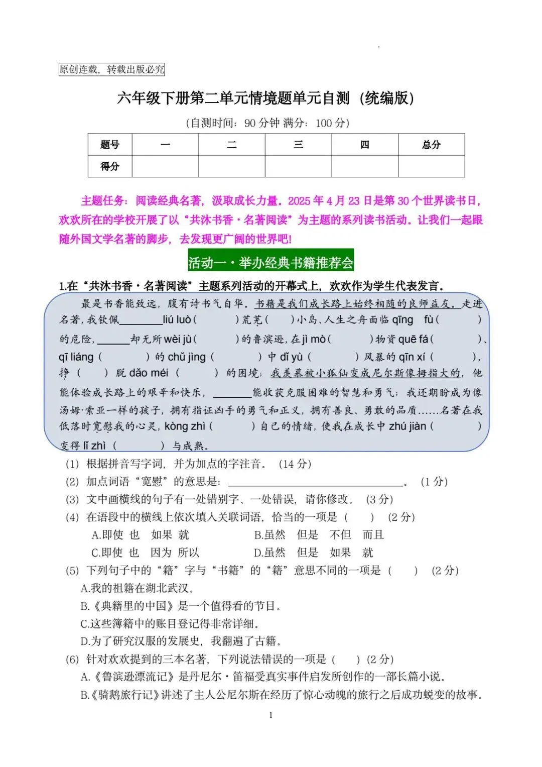 🔥今天给家长们分享资料2026春新版人教部编版六年级下册语文《第二单元检测试卷共4套 含答案》 高清电子版可打印,帮助孩子系统复习第二单元所学的字词、课文内容、语法知识点,及时发现孩子在阅读理解、写作、基础知识等方面的薄弱环节。便于针对性在进行补习和强化。有需要的家长替孩子收藏或抓紧领取一份打印出来🖨️给孩子练一练吧✍欢迎分享到班群或朋友圈,方便家长打印出来助力孩子高效学习不丢分!