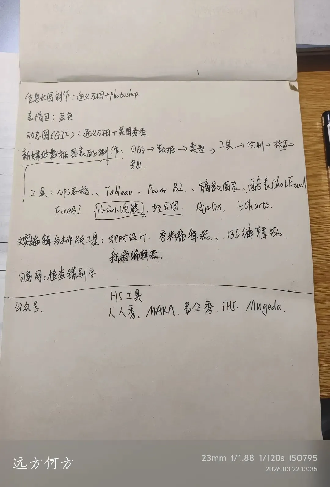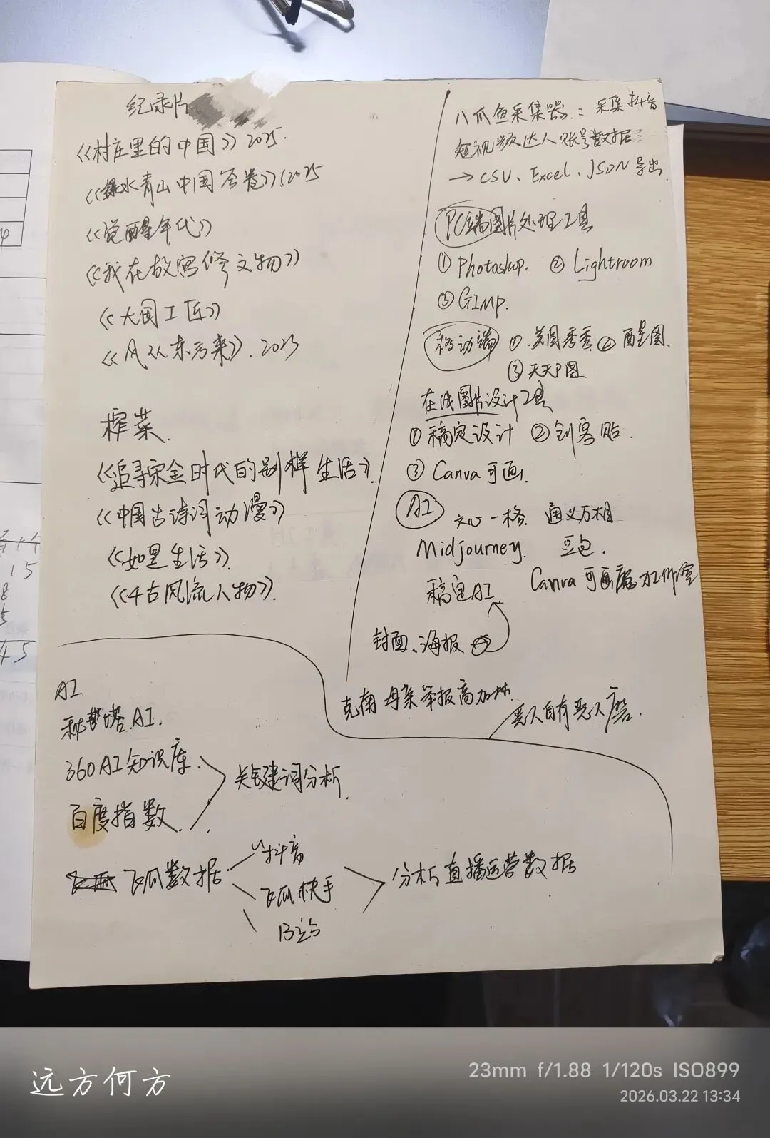 两张笔记,了解新媒体运营ai工具 近来读书几本,今日分享新媒体相关的书籍,了解不同新媒体平台工具还是不错的,比较大众化,易上手,只不过这些工具大部分可能功能需要会员。 纪录片仅是个人其他笔记,可看可忽略。 ↓书内部分操作微课程 来看书吧,欢迎交流学习。