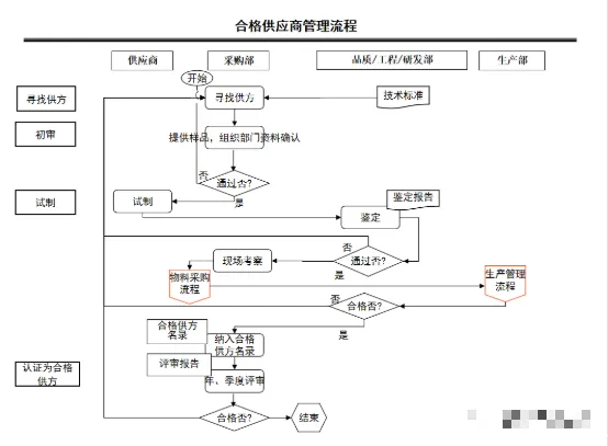 初步评审未经通过则返回重新寻找供应商,经过样品测试及产品测试,试产产品经技术、品管、研发承认确定,未经通过则重新要求供应商试产,试产不合格,则重新寻找供应商;鉴定经通过,采购部组织进行现场考察,现场考察合格后,进行小批量试产,试产不合格,则重新寻找供应商,通过后纳入《 合格供应商名录表》。