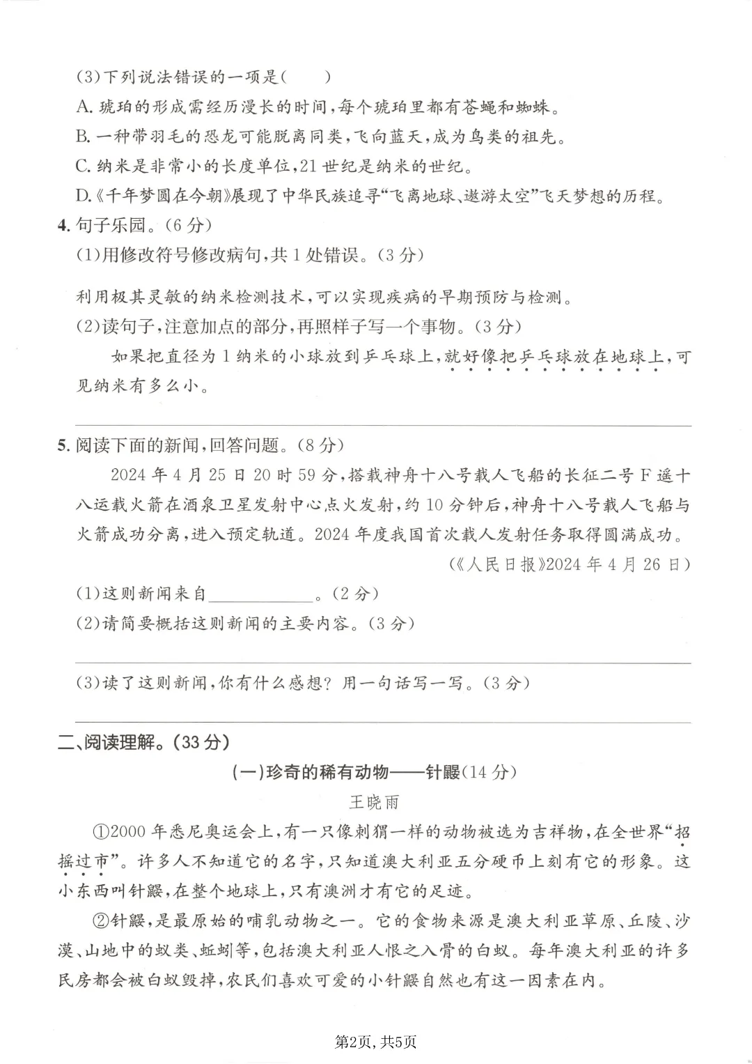 26春·人教部编版四年级下册语文《第二单元测试卷共3套 附答案》 可打印!