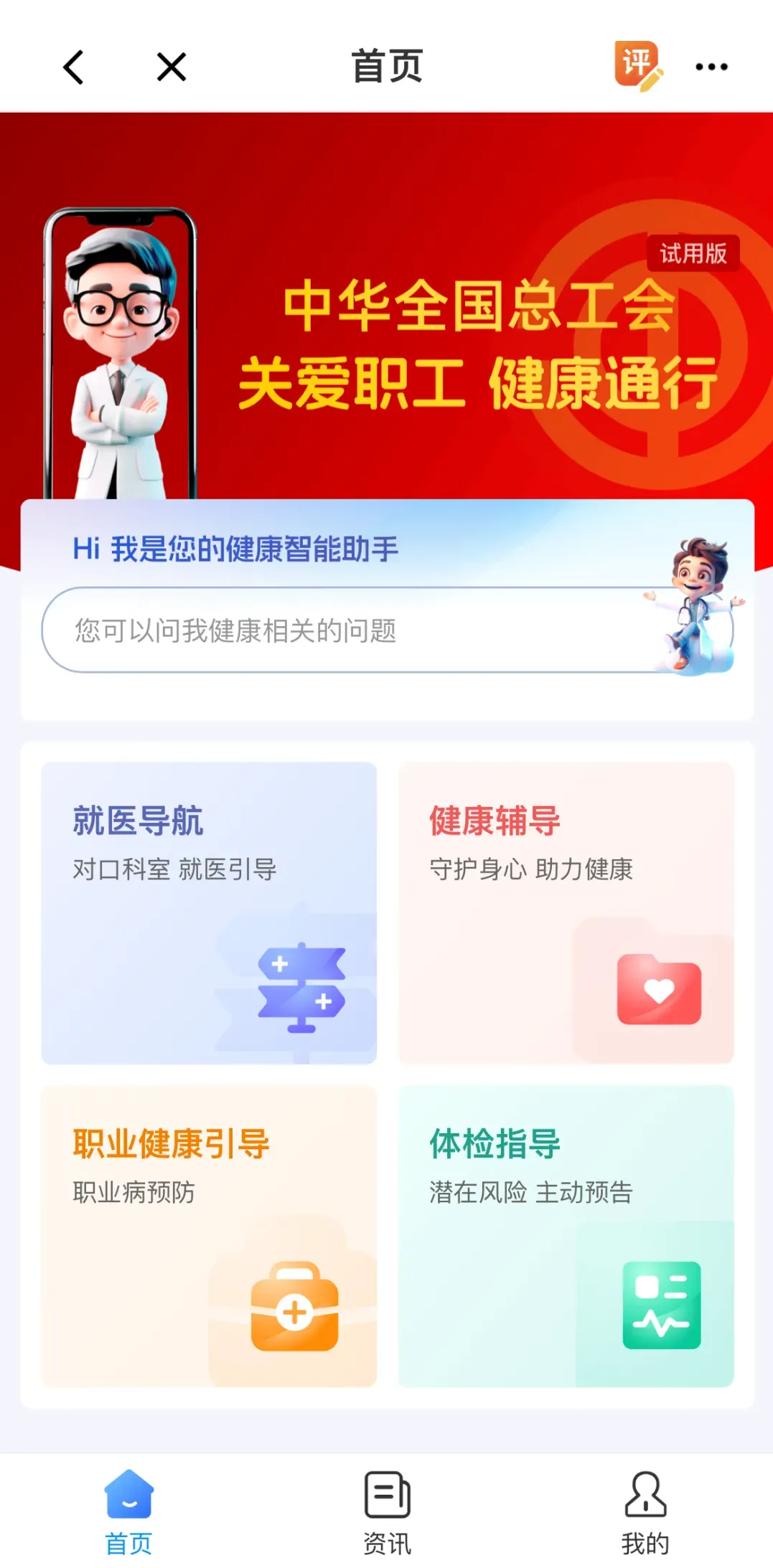服务功能:面向职工免费开放的“健康助手”,依托人工智能技术为职工提供全天候的健康咨询、就医指导、职业病预防和治疗、体检报告解读等便捷、智能的贴心服务。
