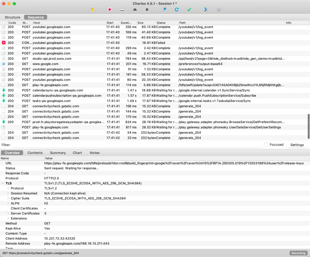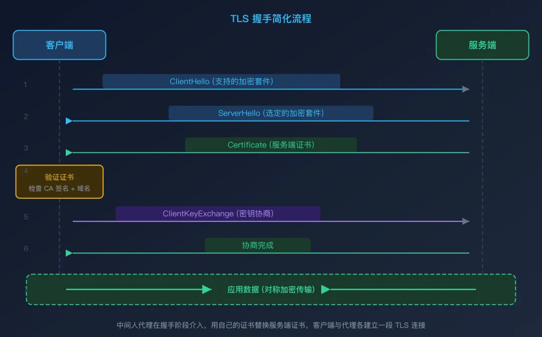 握手完成后,双方使用协商好的对称密钥(如 AES-256)加密所有后续通信。中间人代理正是在握手阶段介入,用自己的证书替换服务端证书,从而让客户端与代理之间建立一个 TLS 连接,代理再与真实服务端建立另一个 TLS 连接,实现对双向流量的解密。