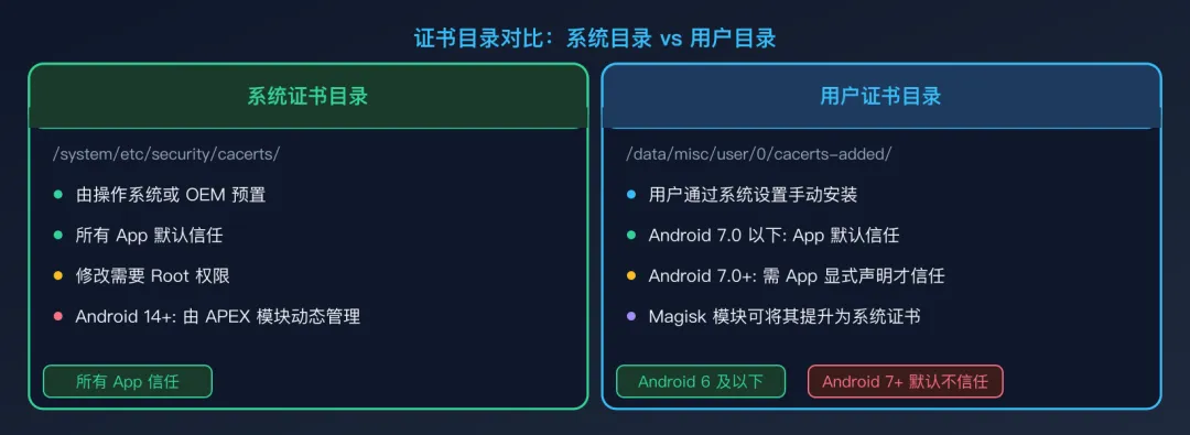 第三阶段(Android 7.0 系统收紧):2016 年 Android 7.0 的发布是一道明显的分水岭。从这个版本开始,Google 修改了系统的网络安全配置(network_security_config),应用默认不再信任用户安装的 CA 证书,只有系统证书目录下的证书才有效。从此,单纯在手机里安装代理证书已无法奏效,必须想办法将证书提权到系统级别。