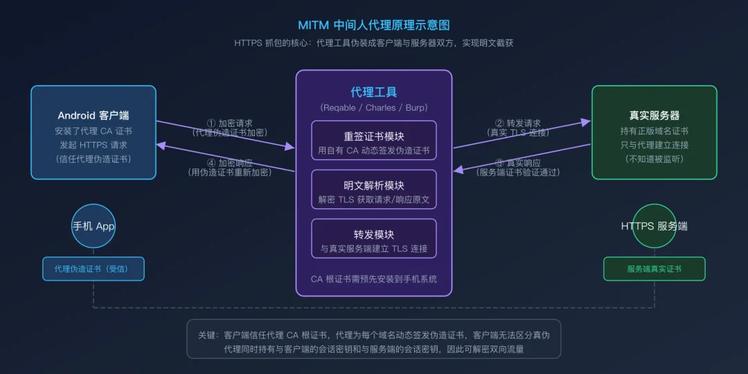 第二阶段(HTTPS 普及):HTTPS 在移动端全面铺开后,中间人(MITM)代理模式应运而生。代理工具通过重签证书实现”合法”的流量拦截,前提是客户端信任代理的 CA 根证书。这个时代,抓包变成了”安装一个证书就能解决”的问题。