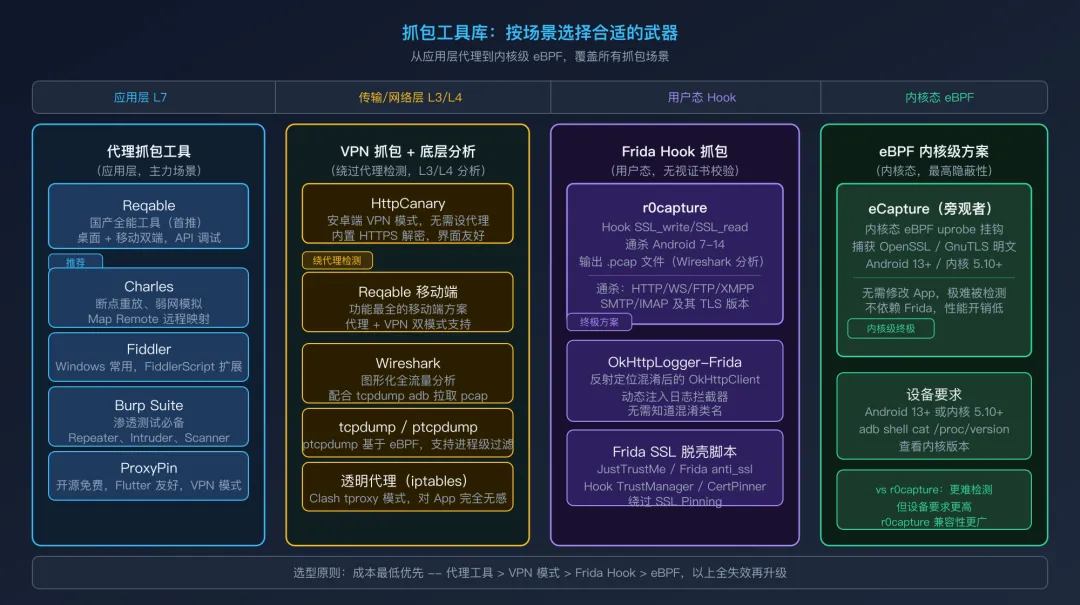 掌握 Reqable、Charles、Burp Suite、r0capture、eCapture 等主流工具的使用场景与选型决策; -