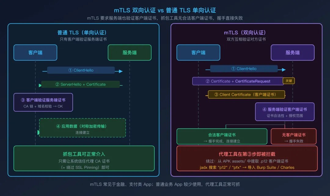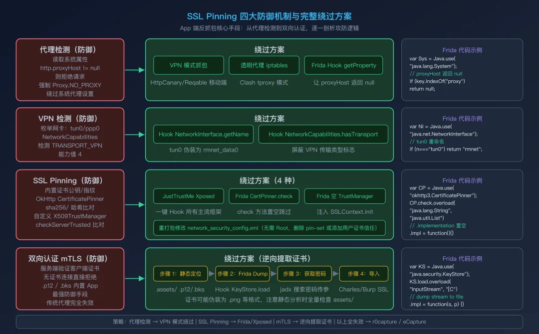 深入理解代理检测、VPN 检测、SSL Pinning、双向认证(mTLS)四大反抓包防御的实现原理; -