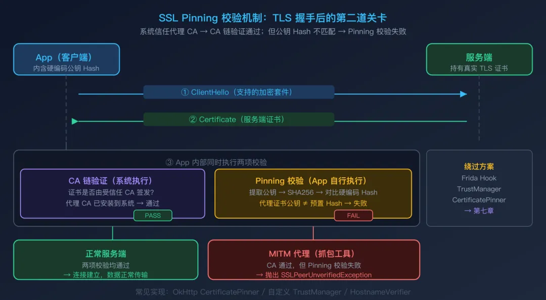 SSL Pinning(证书固定):将服务端证书的公钥哈希硬编码进 App,即使安装了伪造的 CA 证书,握手时也会因指纹不匹配而失败; -