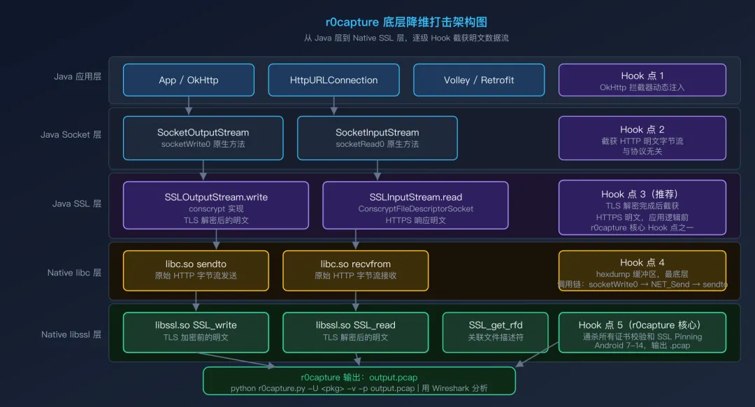 掌握 Frida Hook、OkHttpLogger、r0capture、eBPF uprobe 等多维度绕过方案,附可直接使用的脚本; -