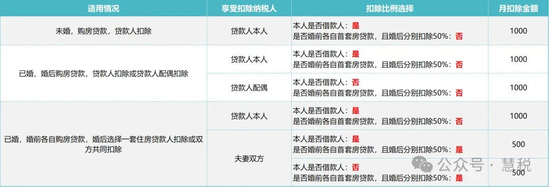 (3)已婚:夫妻双方婚前分别购买住房各自负担首套住房贷款利息,婚后选择其中一套住房,由购买方按扣除标准全额扣除;也可由夫妻双方对各自购买的住房分别按扣除标准50%扣除。