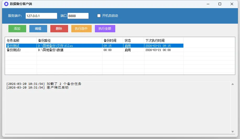 除按设定时间自动执行外,可手动点击 “执行选中” 单独运行某一备份任务,或点击 “执行全部” 一次性运行所有备份任务; -