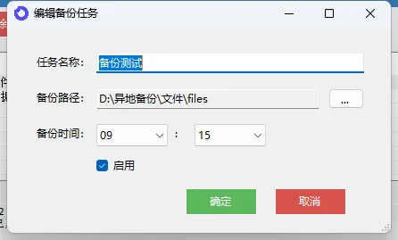 点击 “添加” 创建备份任务,依次设置任务名称(区分不同备份需求)、备份路径(文件备份至服务端的指定文件夹)、备份时间(每日自动备份的具体时间),勾选 “启用” 后点击确定保存;