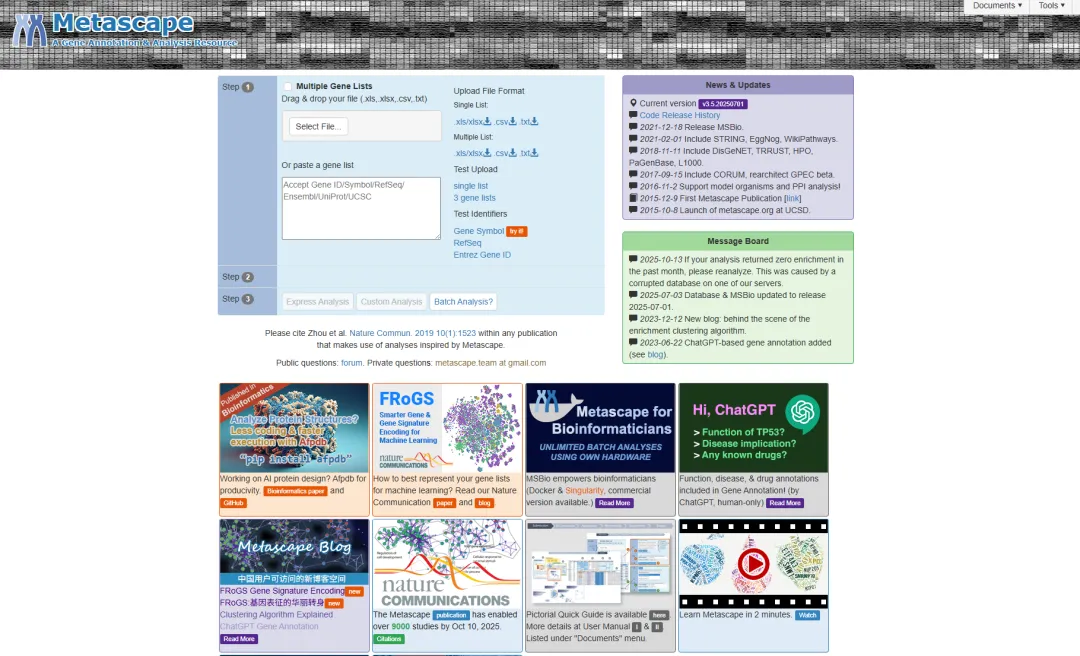 值得注意的是,Metascape 在细节设计上十分贴合科研需求:支持单基因列表与多基因列表分析,还提供 “快速分析” 与 “自定义分析” 两种模式,既满足新手的快速出结果需求,也能让资深研究者根据课题调整参数。不过需提醒的是,若使用其结果发表论文,需引用官方指定文献(Zhou et al. Nature Commun. 2019),这也是科研严谨性的基本要求。