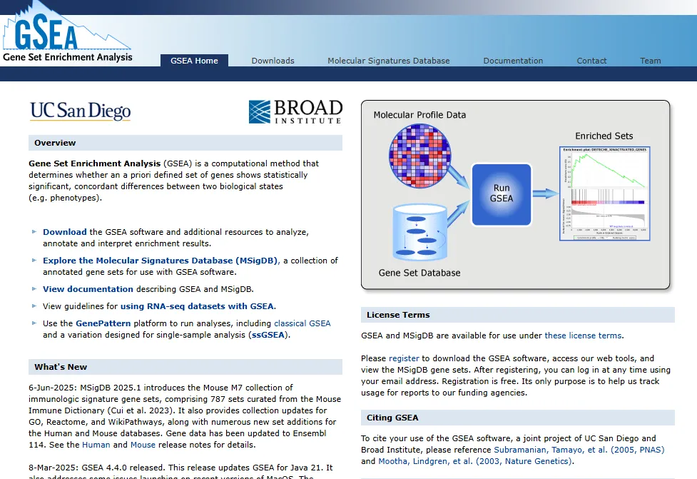 GSEA 的另一大优势是 “跨平台兼容性”:官网提供适用于 Windows、macOS、Linux 等不同操作系统的软件,科研人员可下载至本地使用,避免了在线工具依赖网络、数据上传隐私泄露的风险。其结果呈现也十分直观,通过富集图可清晰看到目标基因集在排序基因列表中的分布情况,以及核心富集基因的贡献。