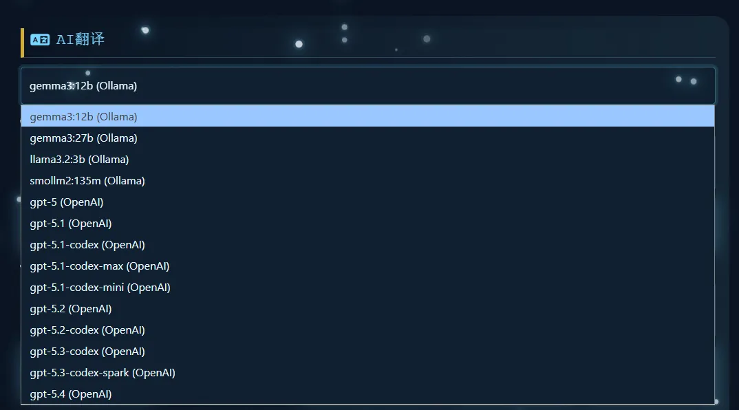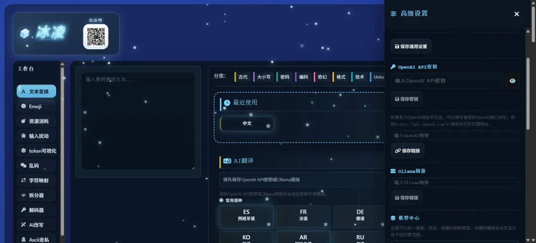 高级设置可设置Open AI的密钥调用官方的key,也可以使用第三方中转站。这里的API key是纯前端,后端不会保存。如果介意的话,也用不上翻译和下面的AI改写,也可以不配置。
