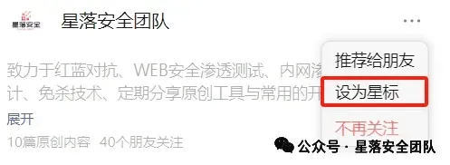 现在只对常读和星标的公众号才展示大图推送,建议大家能把星落安全团队“设为星标”,否则可能就看不到了啦!