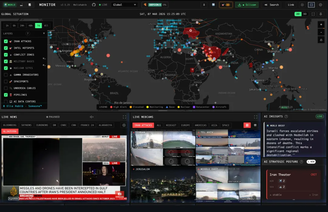 简单来说,它就是一个实时的全球情报仪表盘。它能帮你把全网乱七八糟的新闻、市场数据、甚至服务宕机情况,全部整理在一个极具赛博朋克感的界面里。