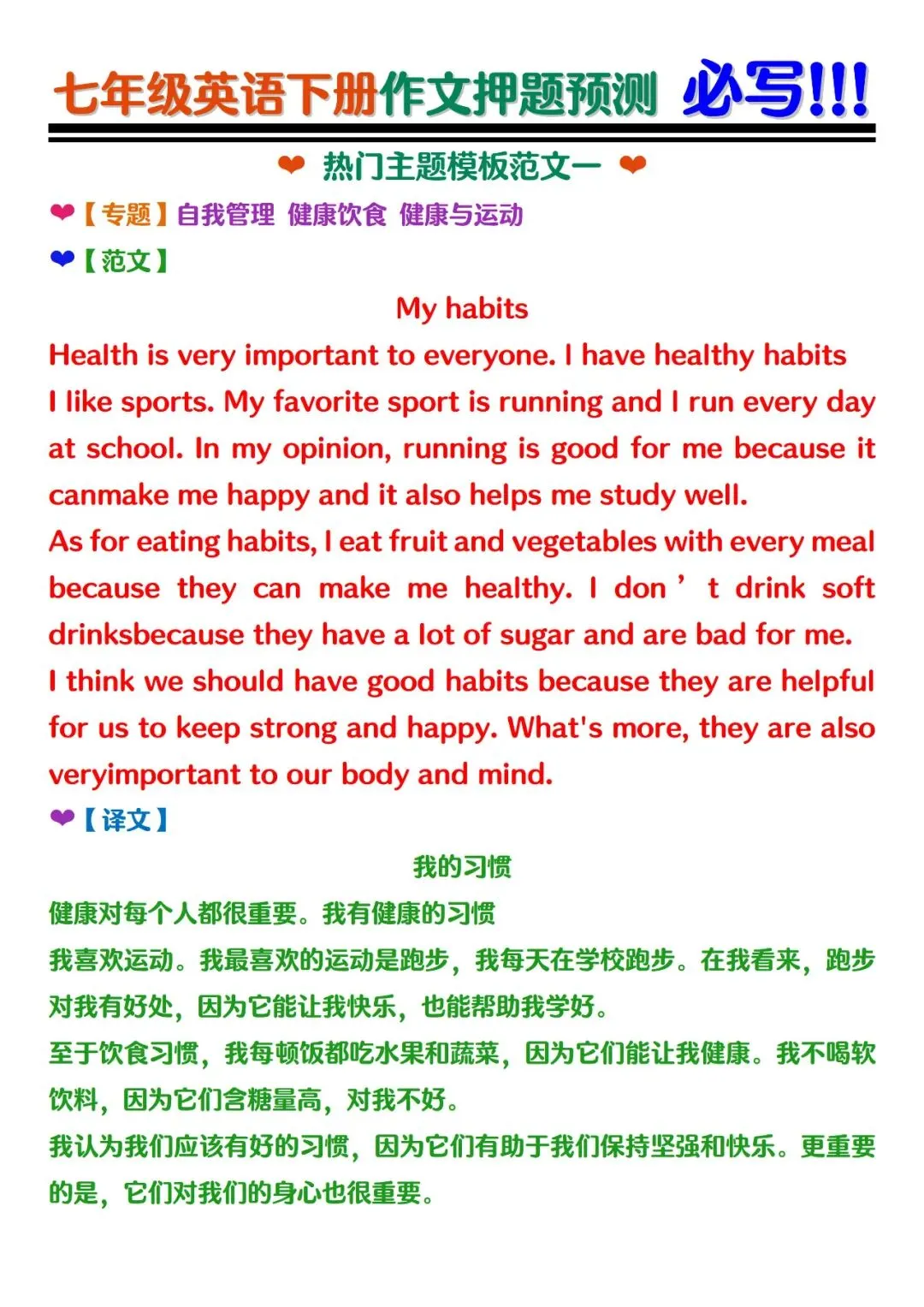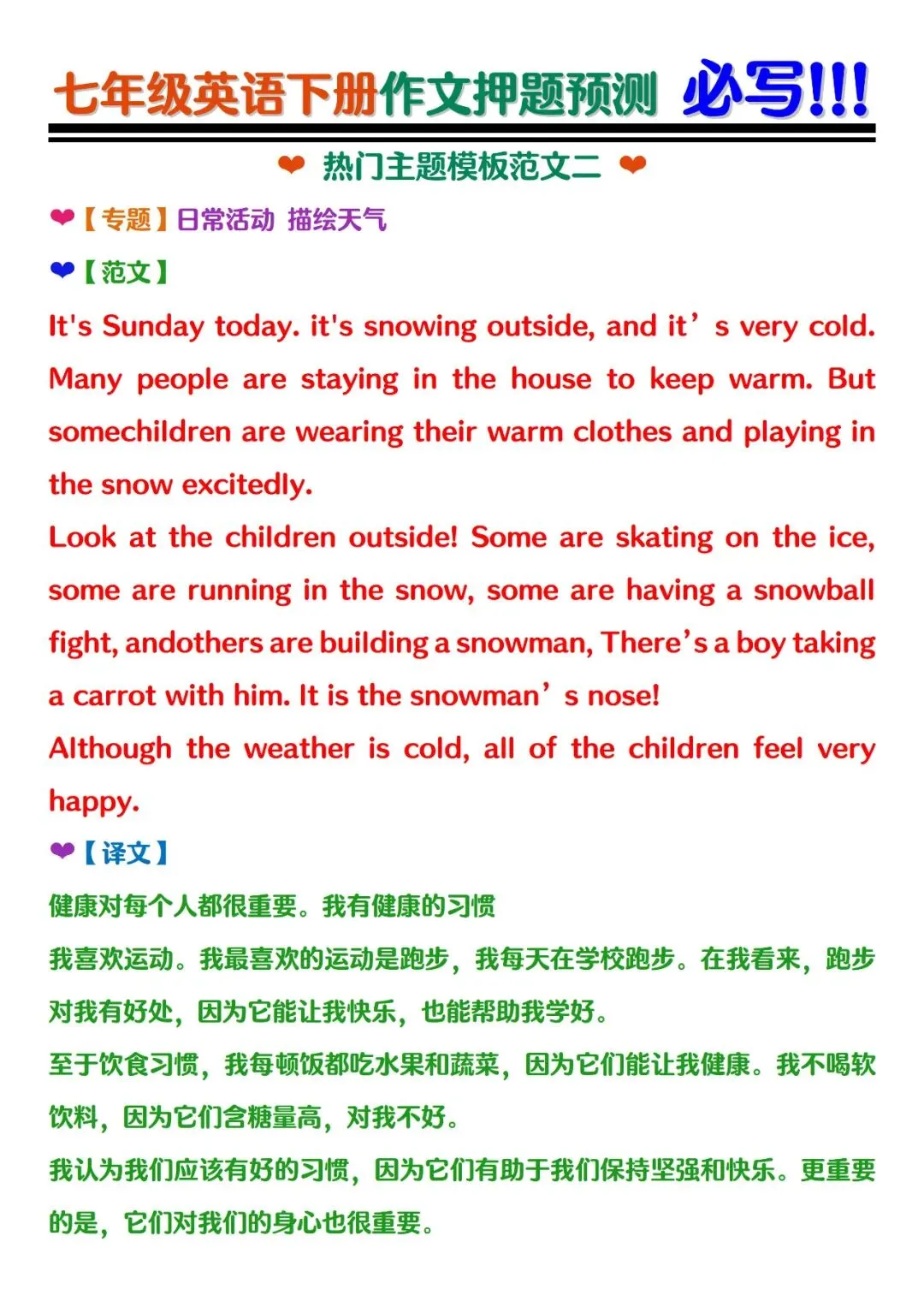 七年级下册英语期末作文押题预测范文电子版可打印