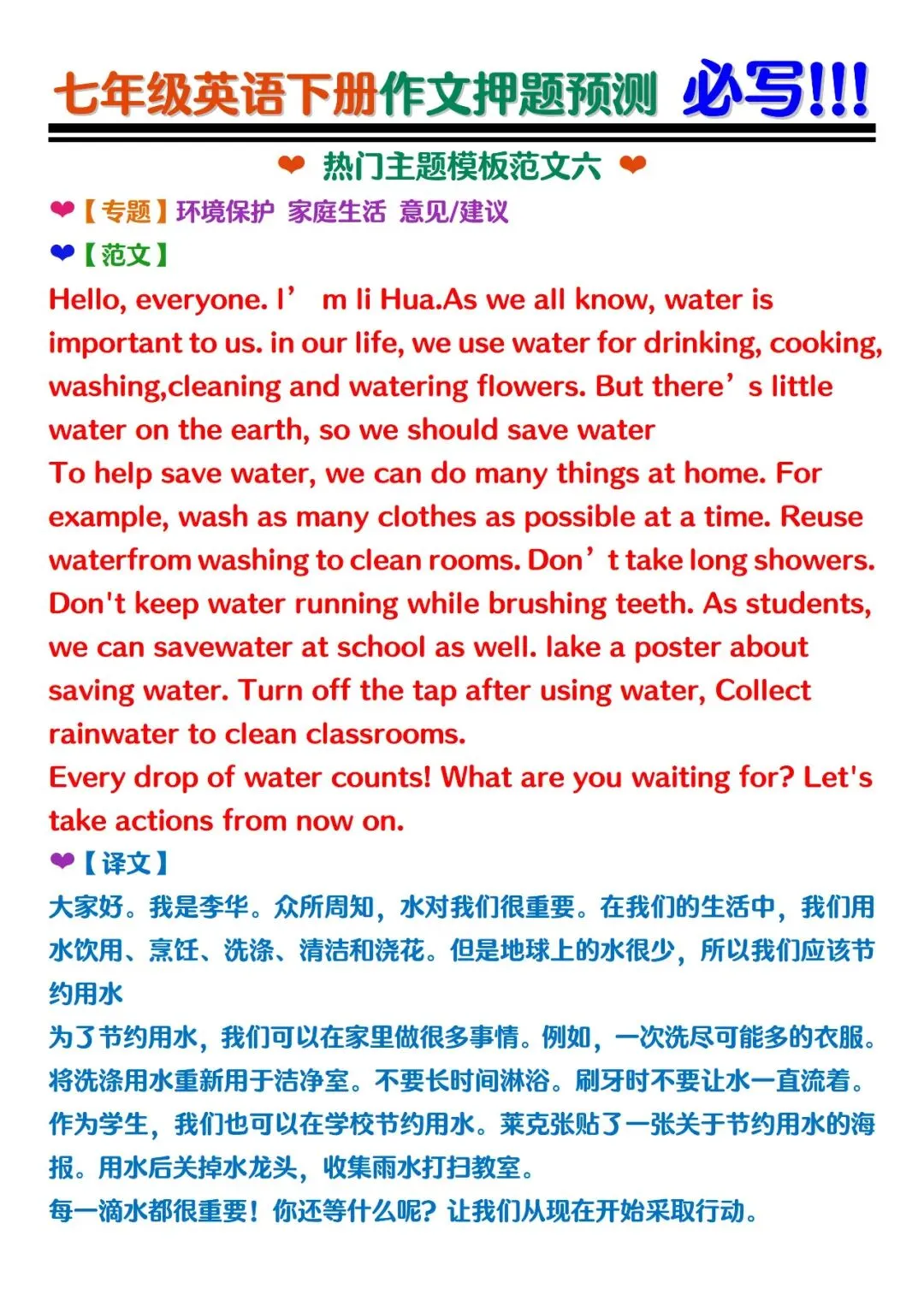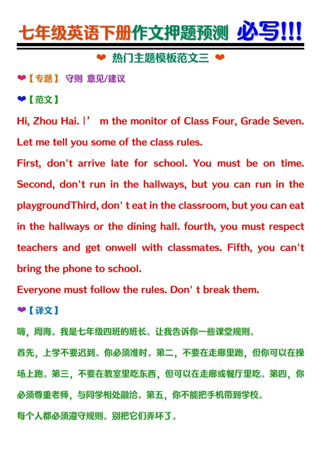 今日老师为大家整理了:七年级下册英语期末作文押题预测范文电子版可打印