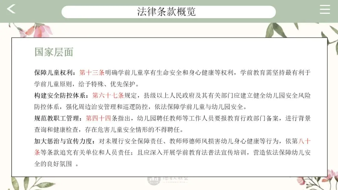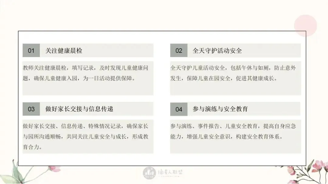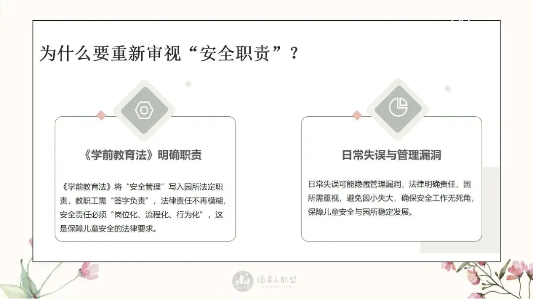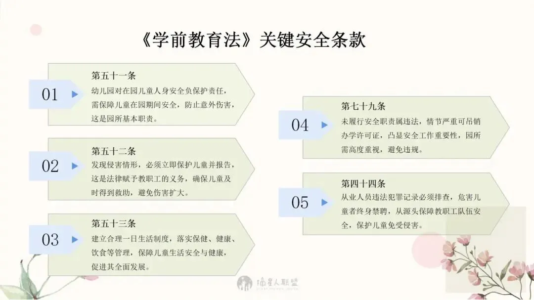用“法律视角”让家长更理解园所安排,防止误解和投诉。明确安全责任边界,向家长说明哪些是园方责任,哪些是家长应配合的。营造共同守护氛围,提升家庭支持度与园所口碑。