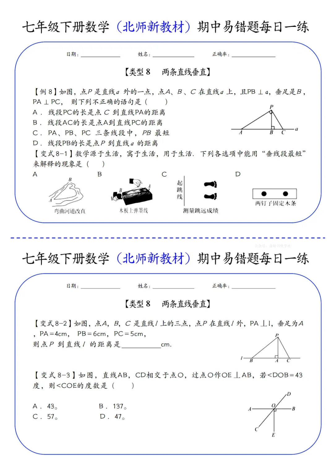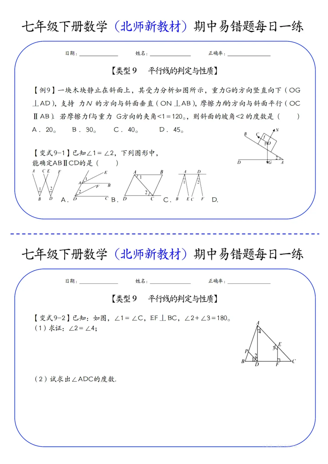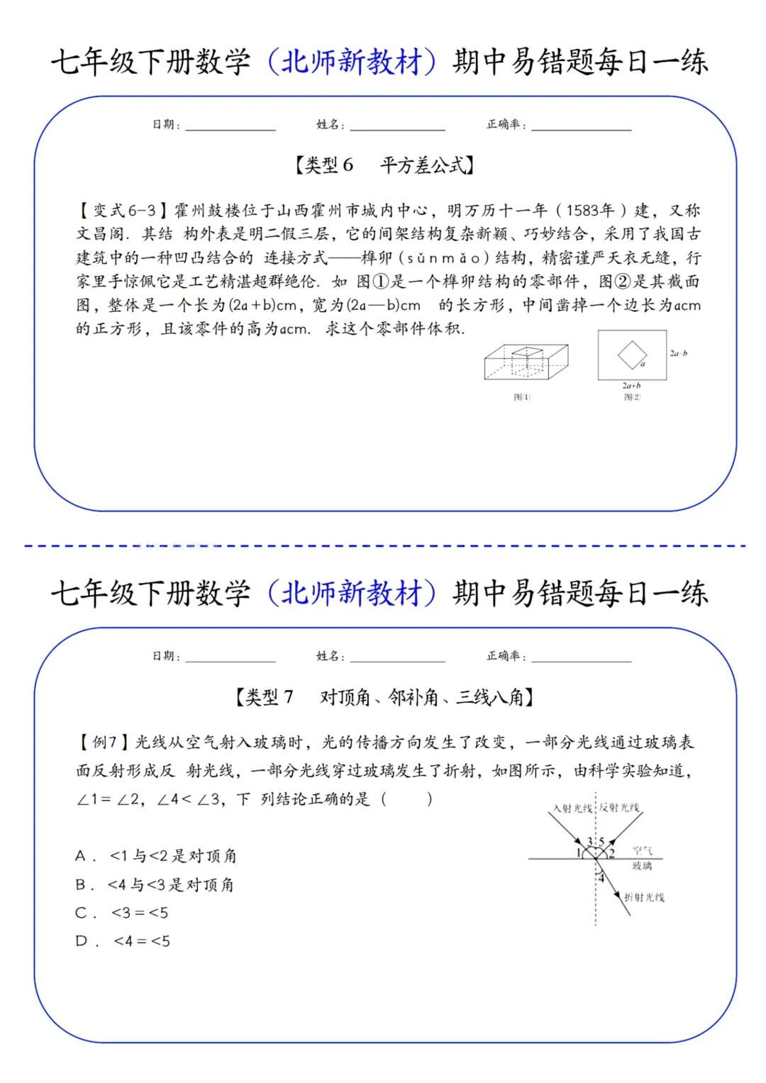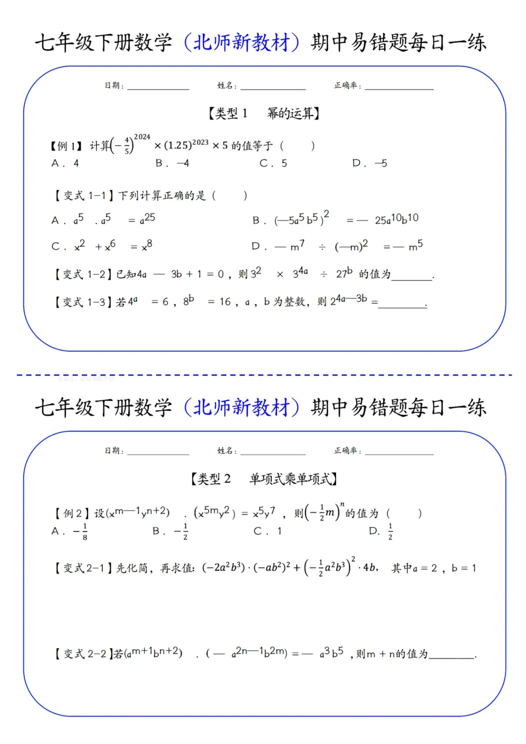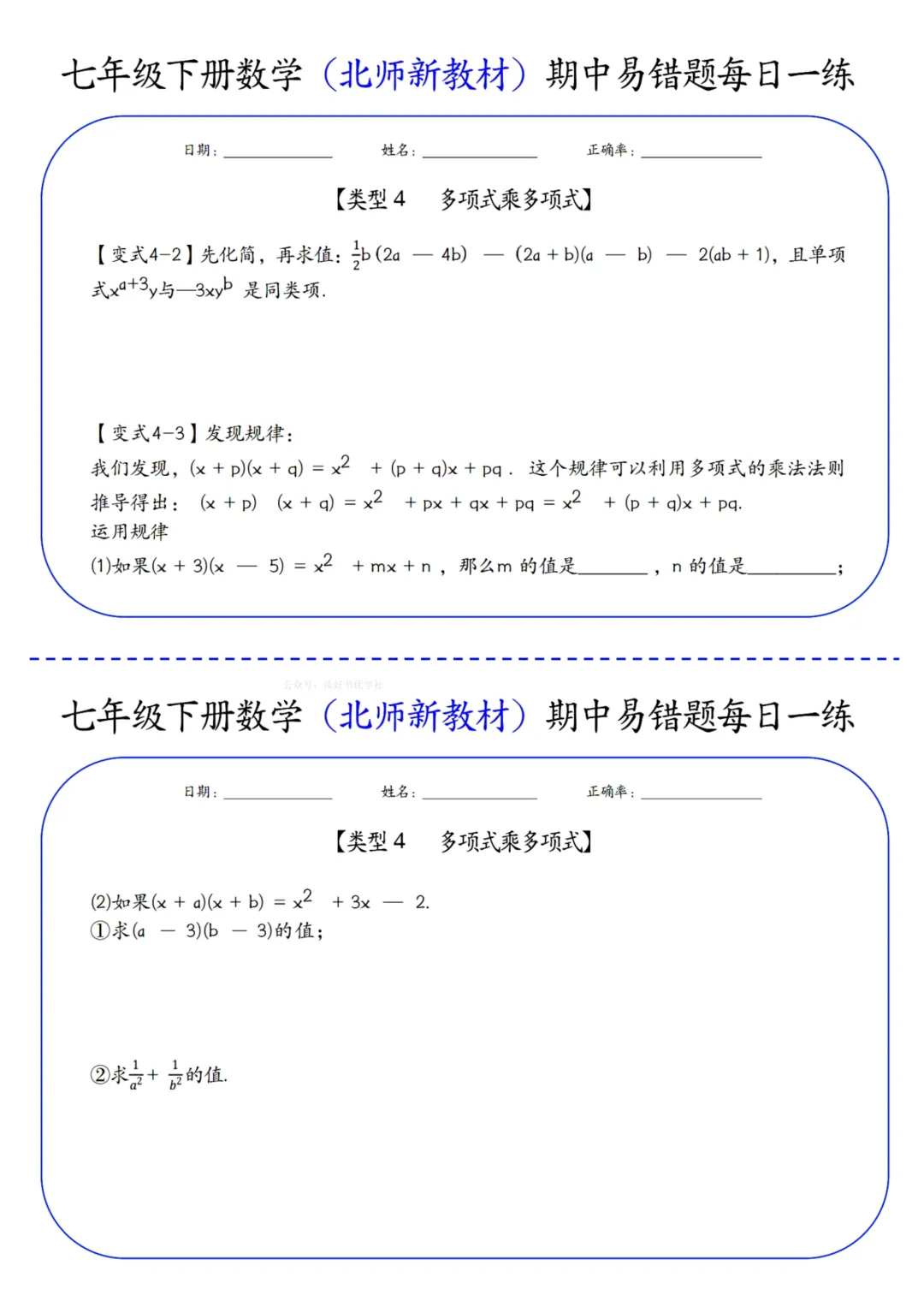 七年级下册初中数学新北师版期中易错题每日一练,电子版可打印