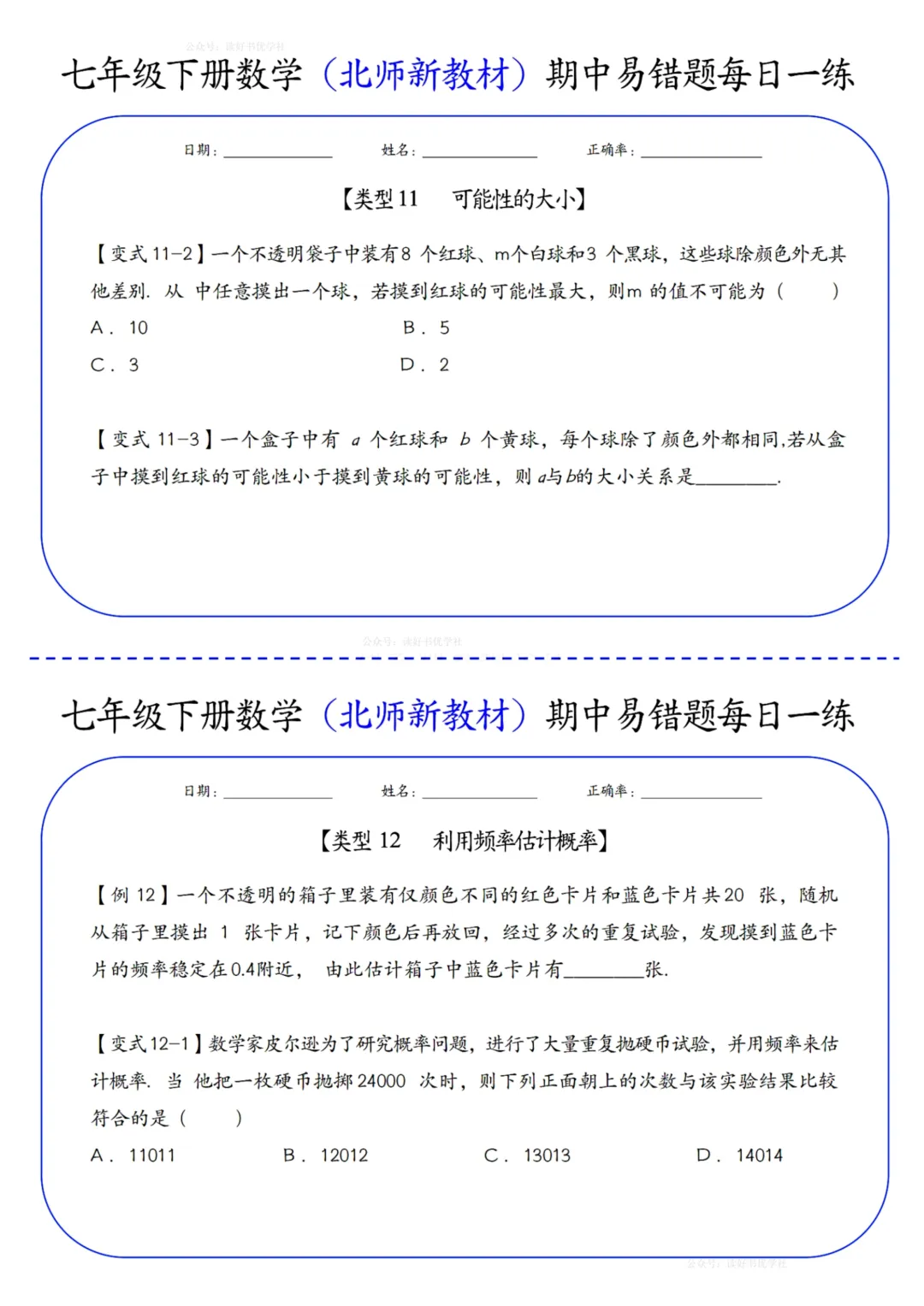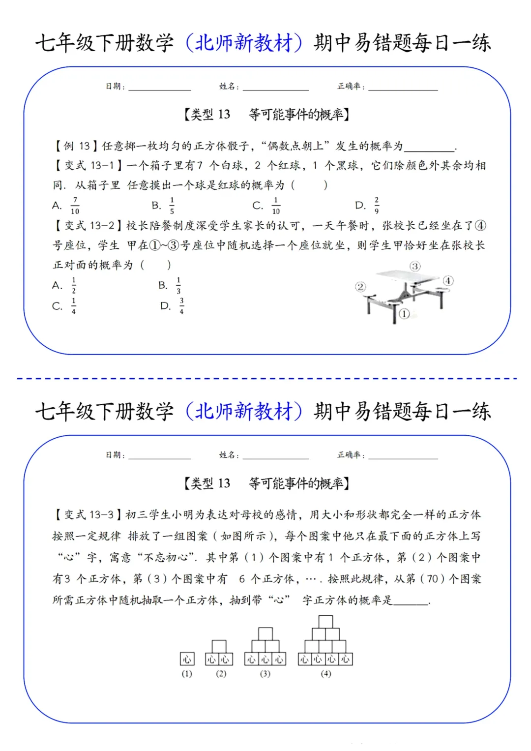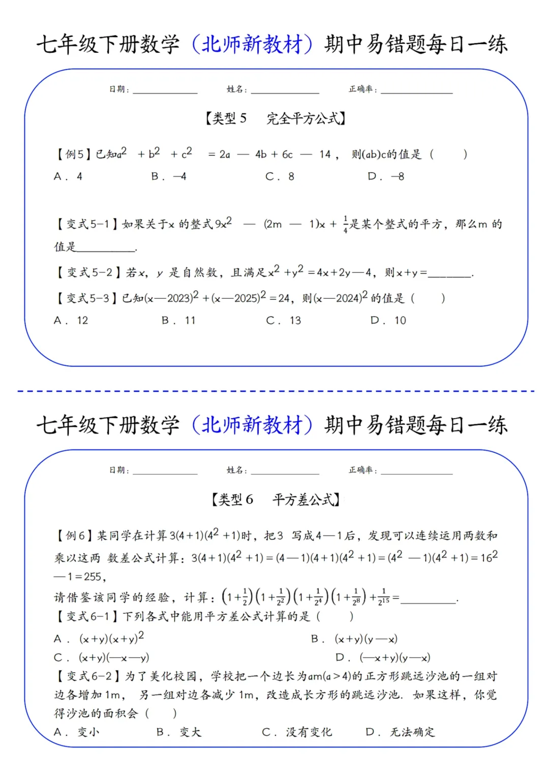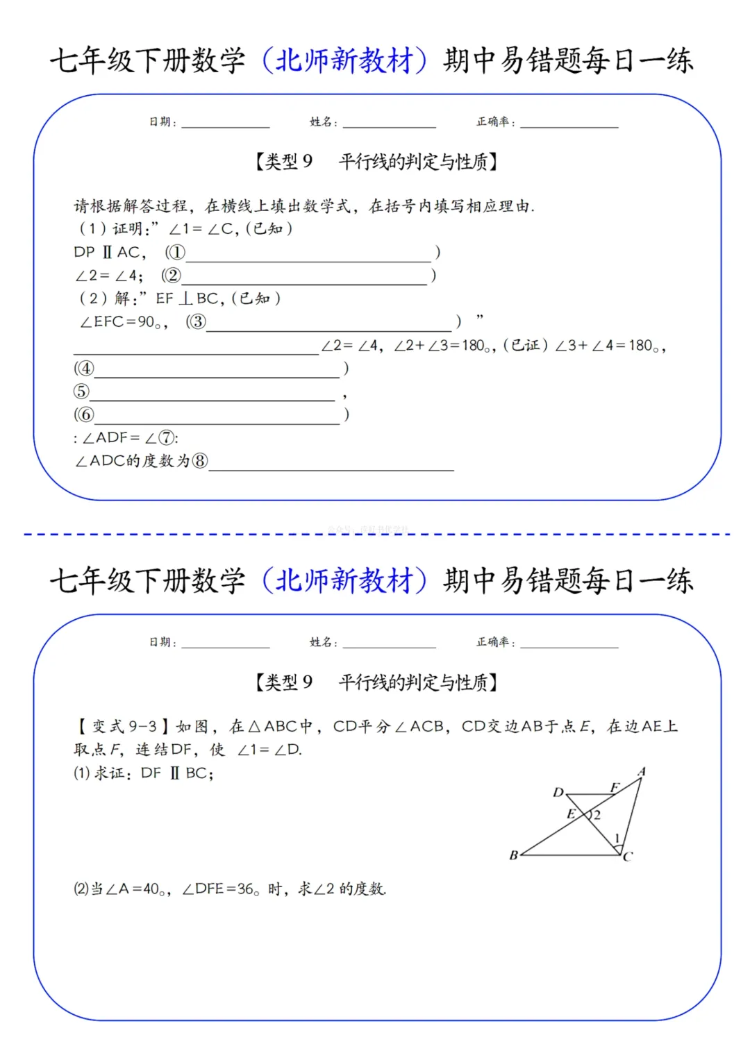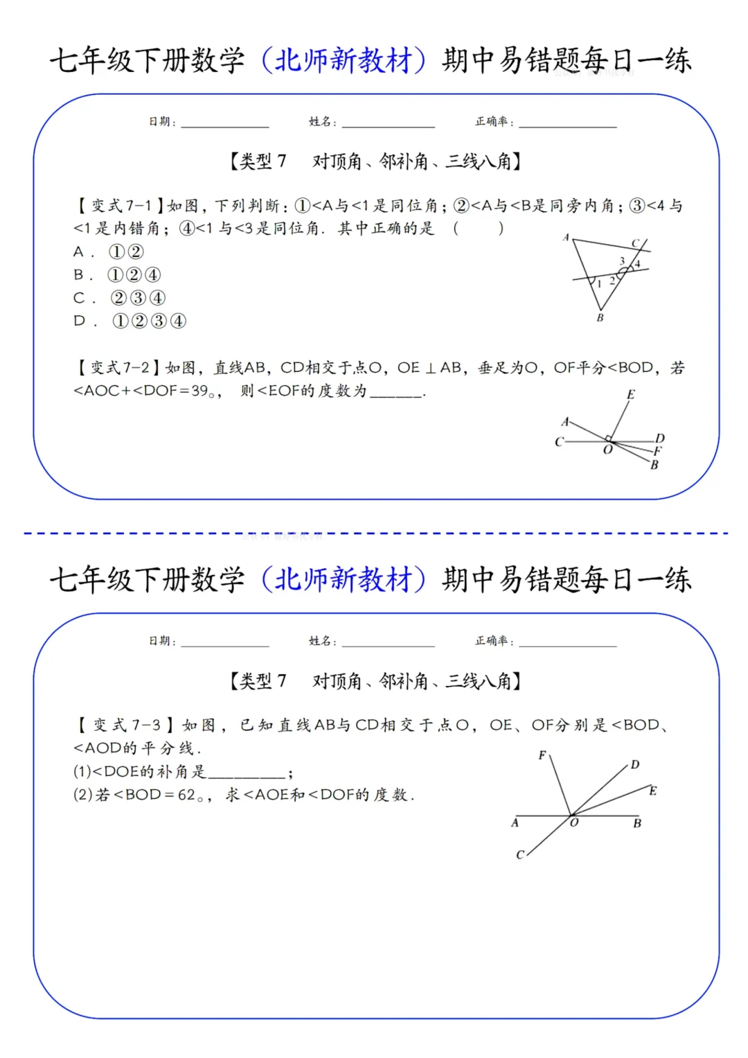 七年级下册初中数学新北师版期中易错题每日一练,电子版可打印