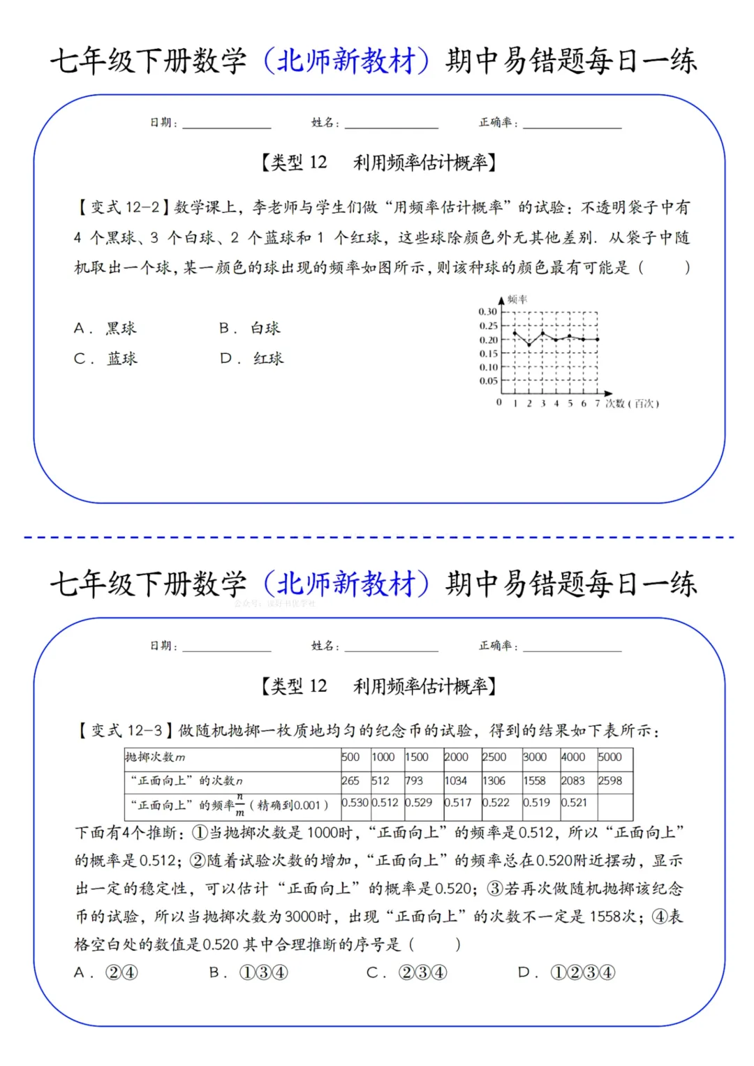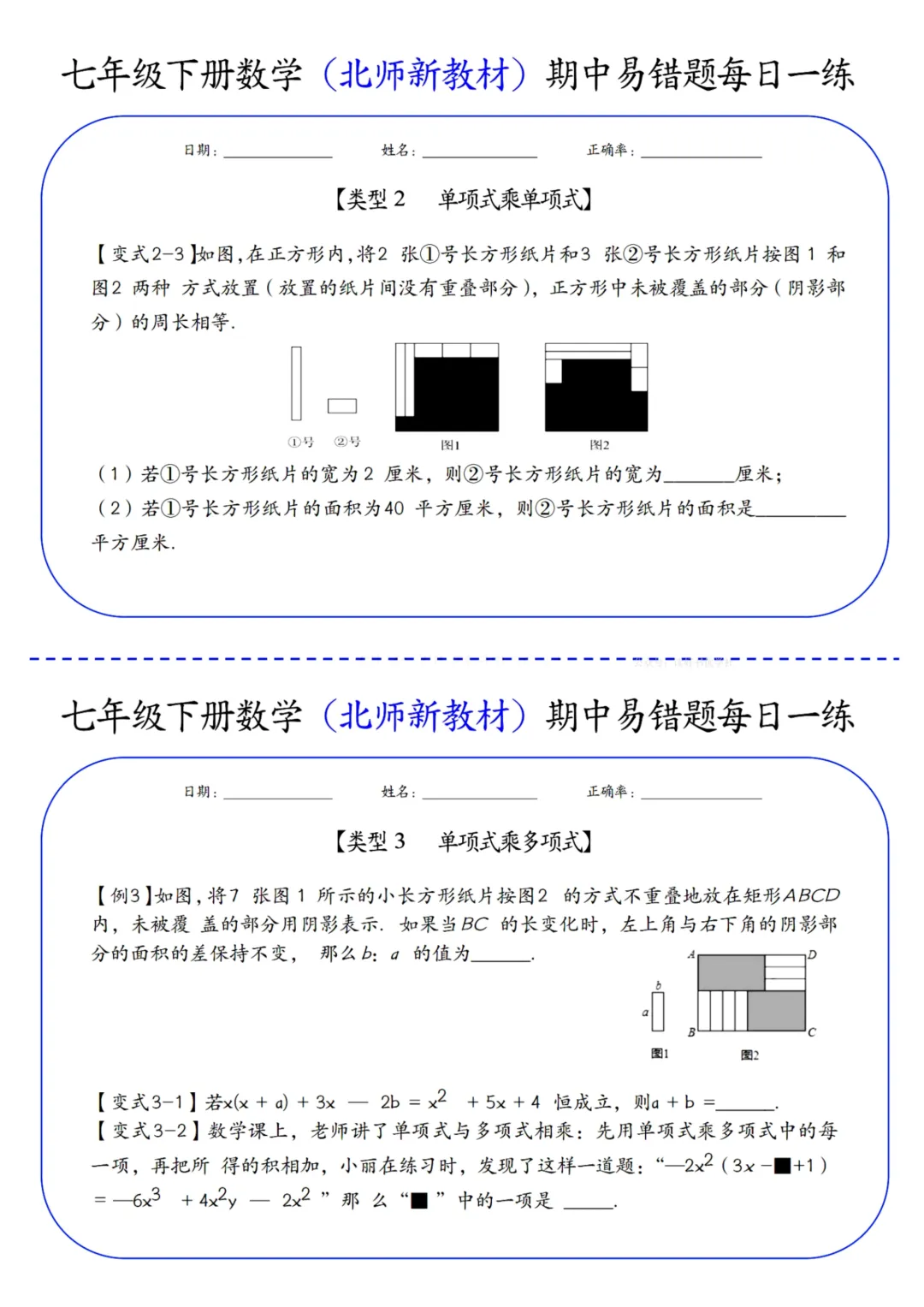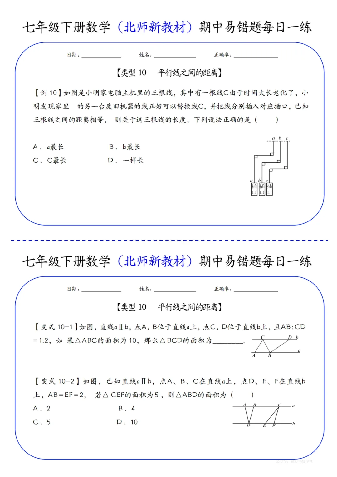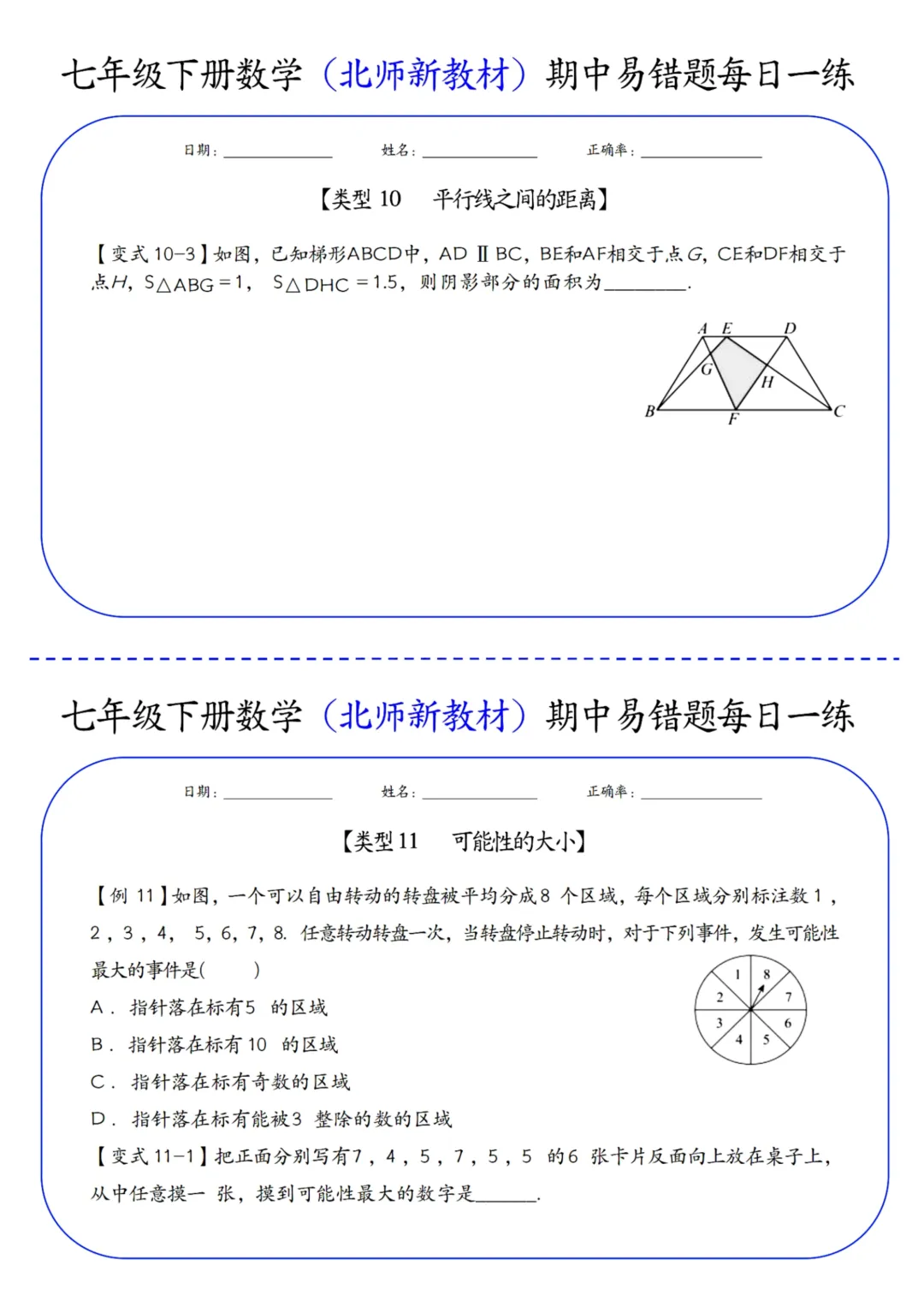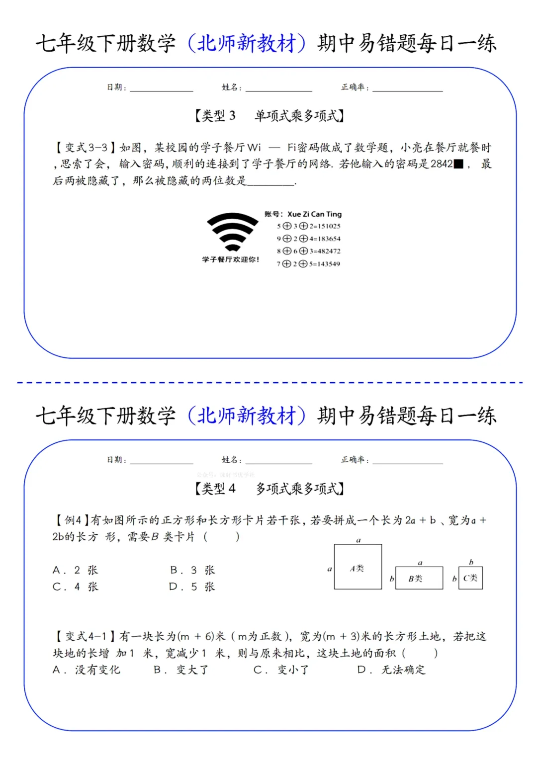 七年级下册初中数学新北师版期中易错题每日一练,电子版可打印