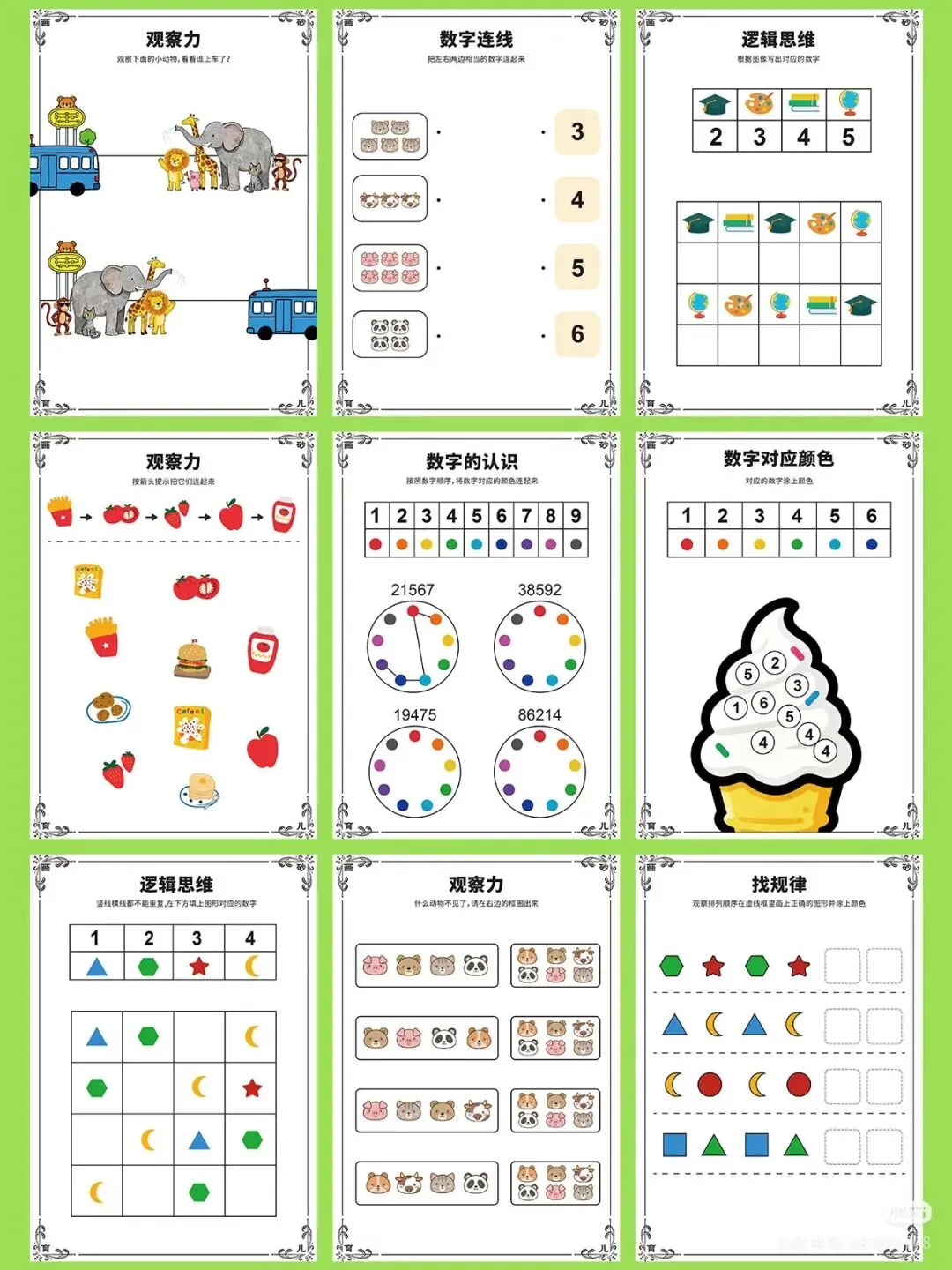 适合3-6岁幼儿园小班、中班、大班及幼小衔接阶段的孩子,用于数学思维启蒙和日常专注力训练,家长和老师都能直接使用。