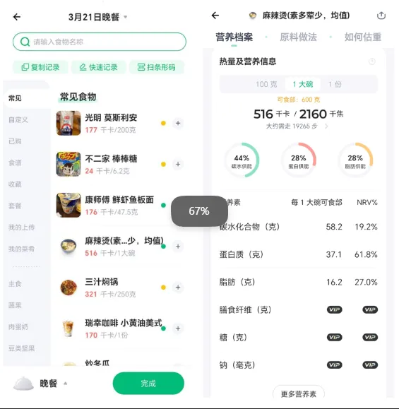 对于常吃的家常菜或固定搭配,用户可以创建自定义食谱。下次食用时,只需一键添加整份食谱,无需重复录入每种食材,非常适合有固定饮食习惯的用户。