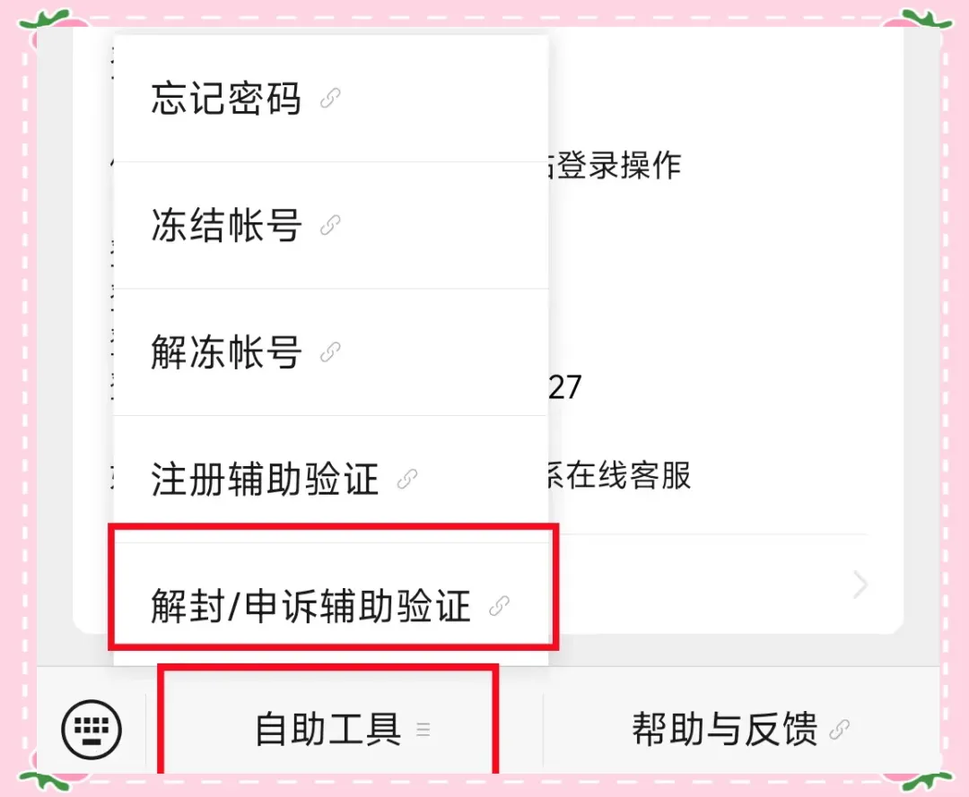 点击公众号左下角的“自助工具”,选择“解封/申诉辅助验证”; -