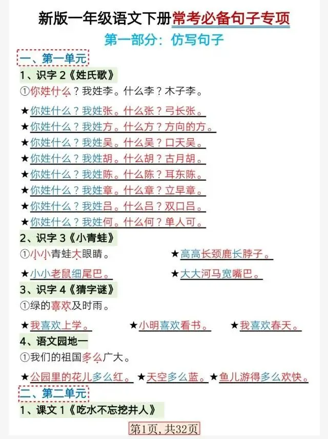 新版一年级语文下册常考必备句子专项.pdf