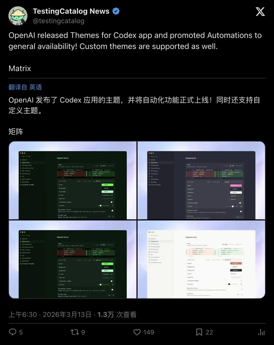 ▲ OpenAI 官方持续为 Codex app 补充平台能力,包括 themes、automations、subagents 等功能