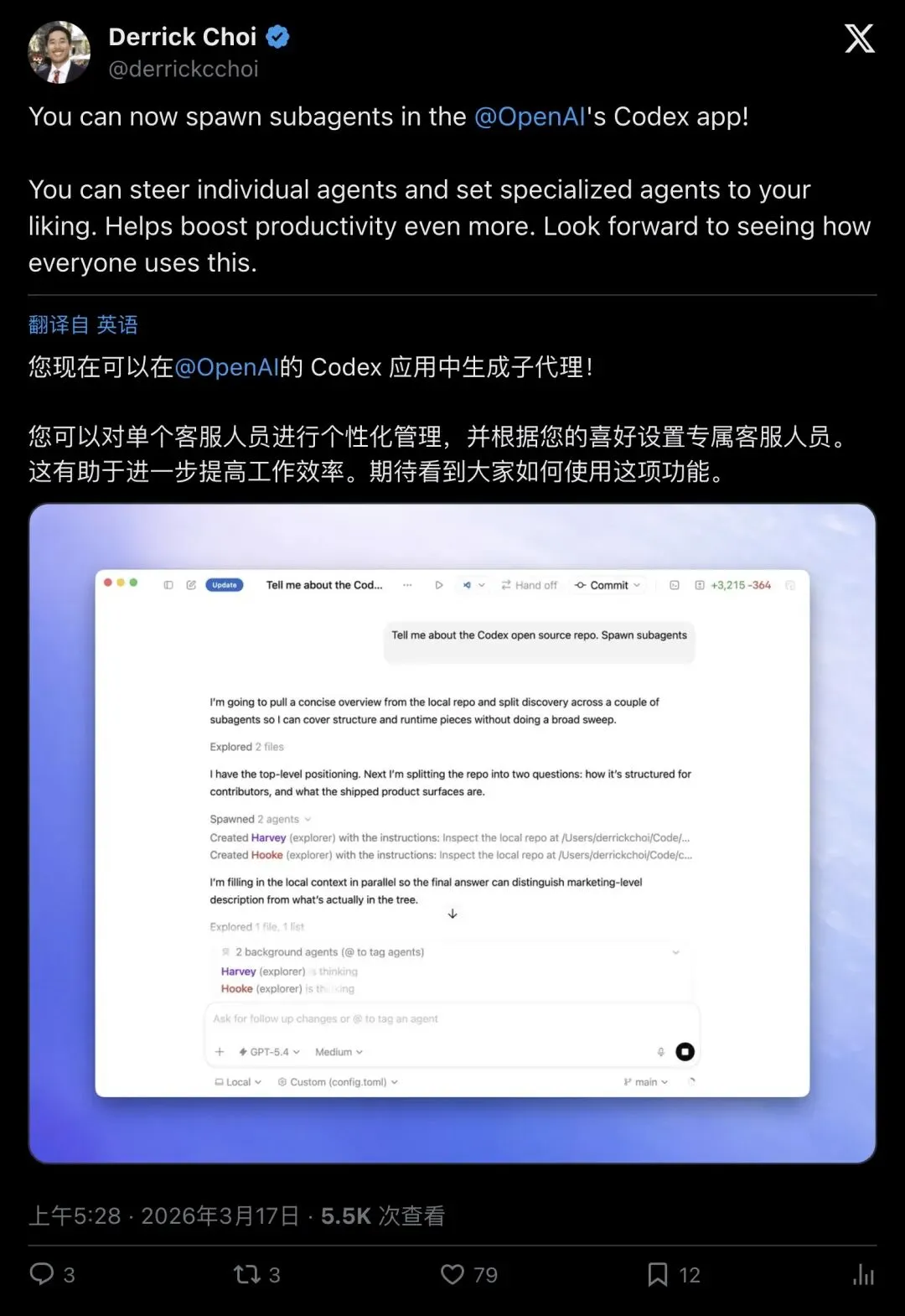 ▲ Codex app 现在支持 spawn subagents,让不同的 AI agent 并行工作