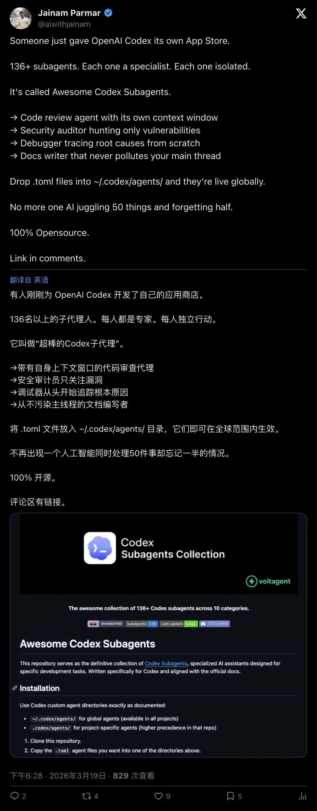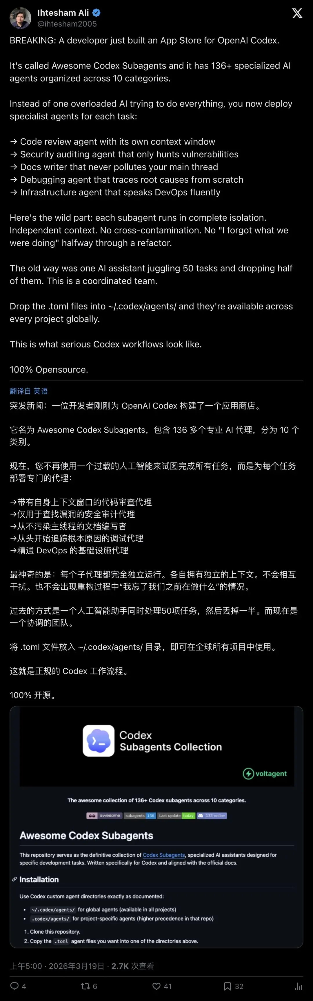 ▲ 社区直接喊出了「Codex 的 App Store」,136+ 个专业子代理已冒头